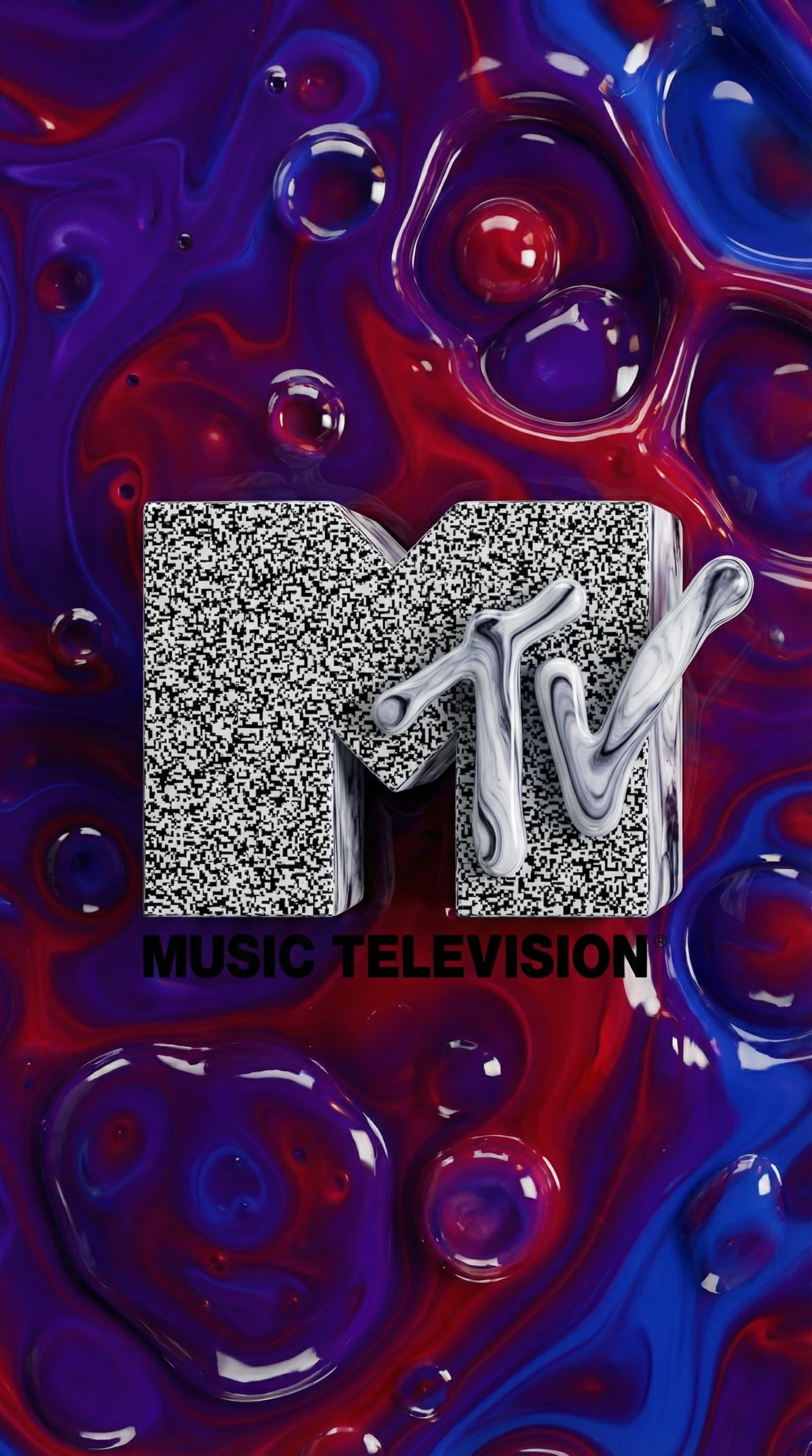 This vibrant image features the iconic MTV logo rendered with a mix of static and marble textures. The logo floats ab...