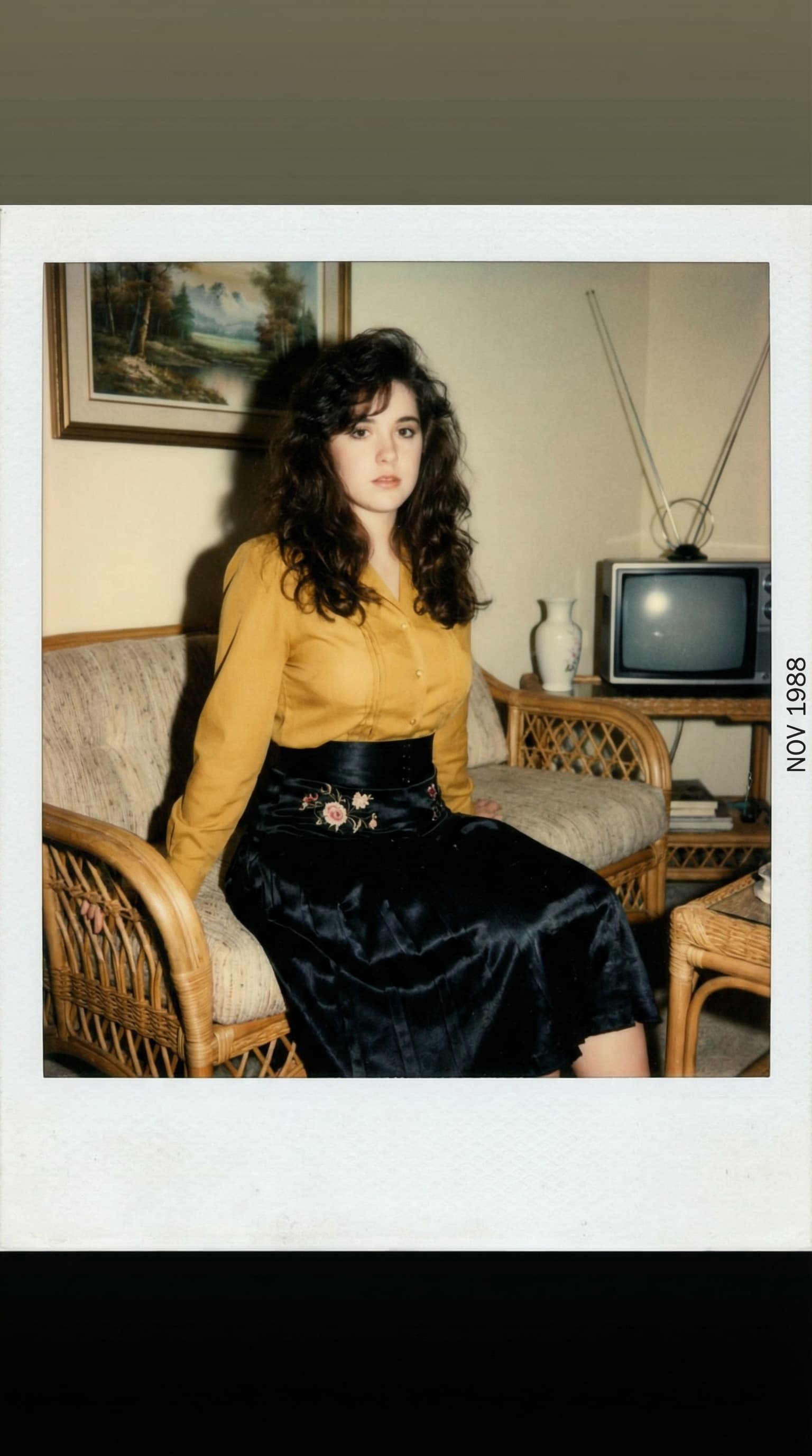 This image, reminiscent of a late 1980s Polaroid, captures a young woman seated on a wicker couch in a softly lit int...