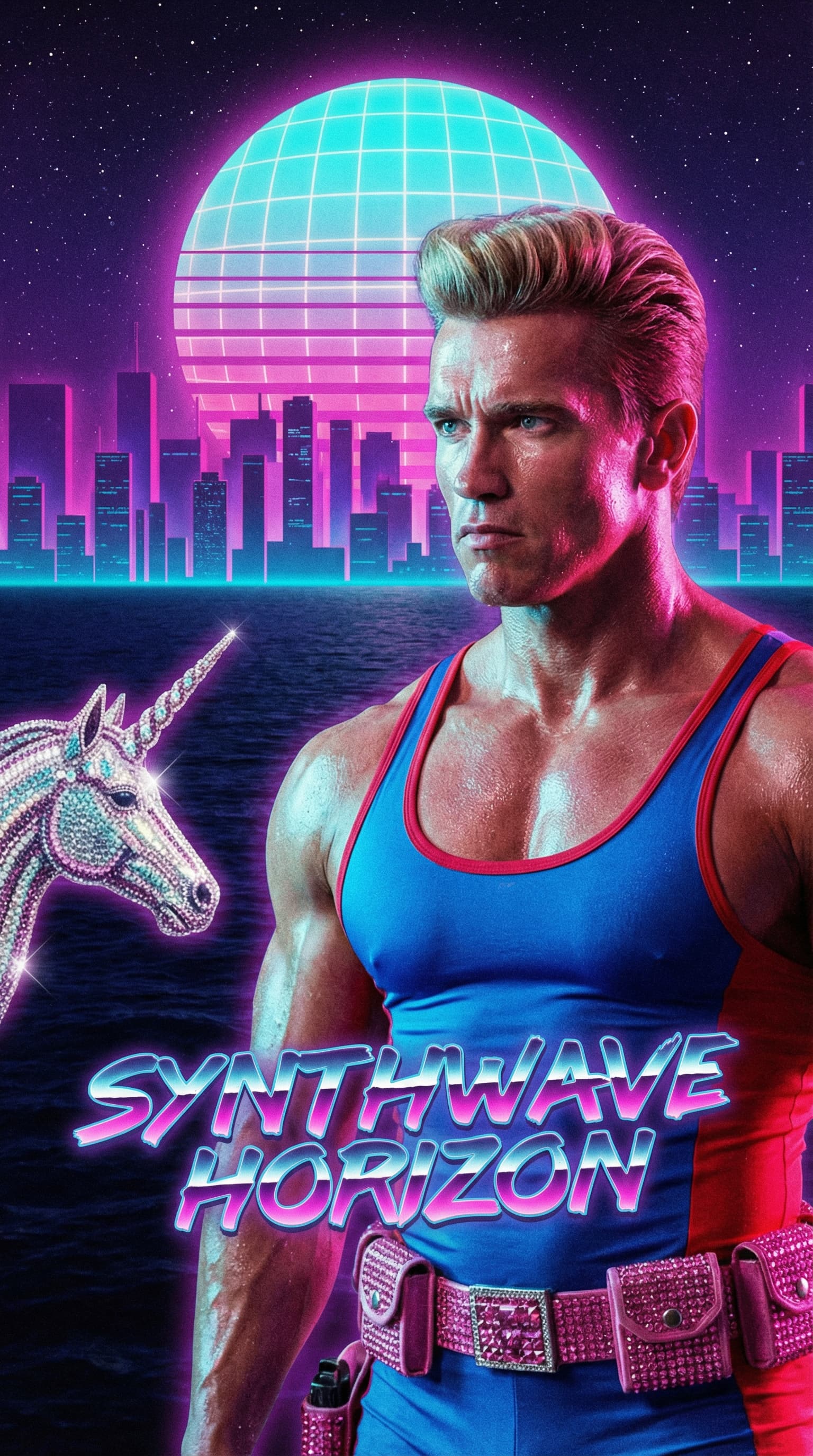 This image evokes the 1980s with its neon-drenched cityscape and synthwave aesthetic. A muscular figure, perhaps a fu...