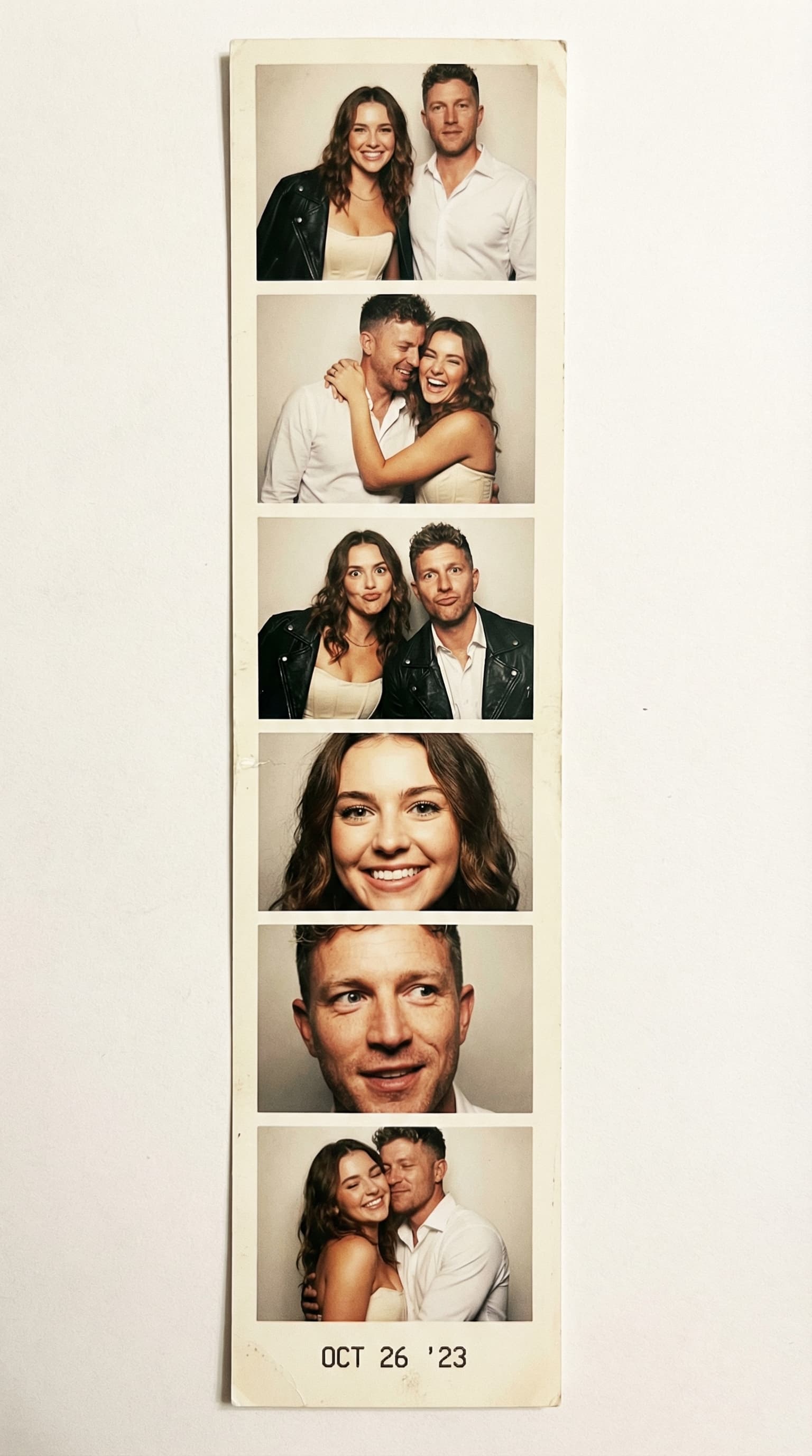 This portrait captures a series of candid moments between a couple in a photobooth. The vintage-style images, dated O...