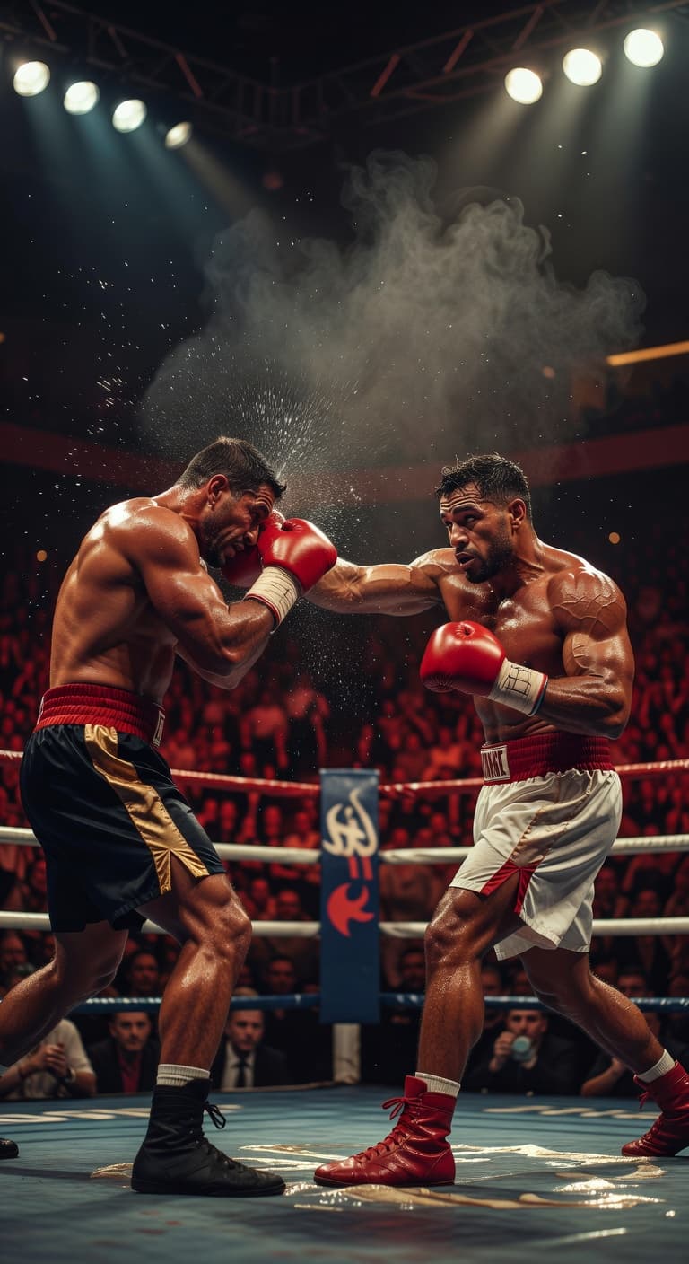 This image captures the intensity of a boxing match, with two muscular fighters trading blows under bright arena ligh...