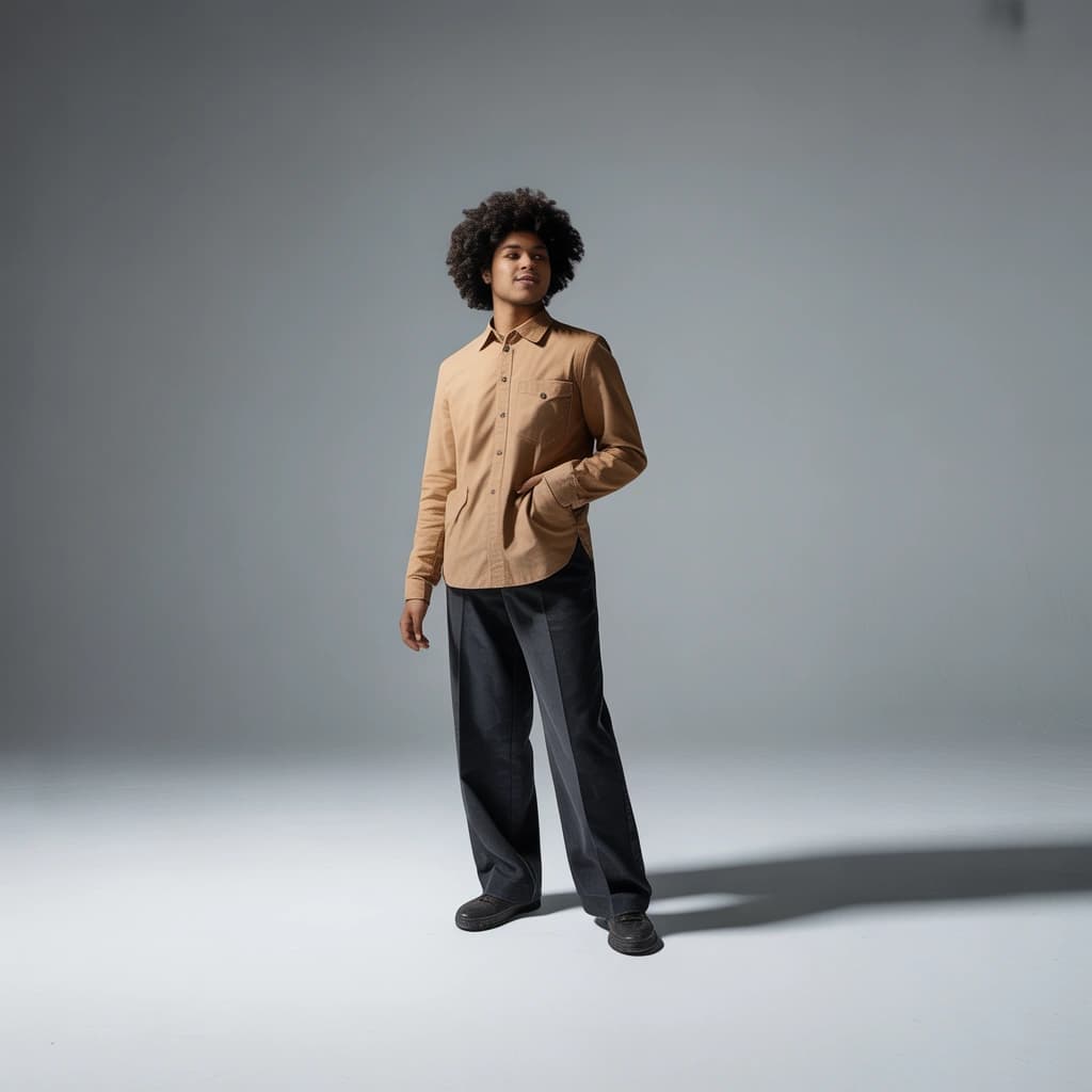 A young person with an afro stands in a neutral gray space, gazing to the side. The portrait, lit softly, captures a ...