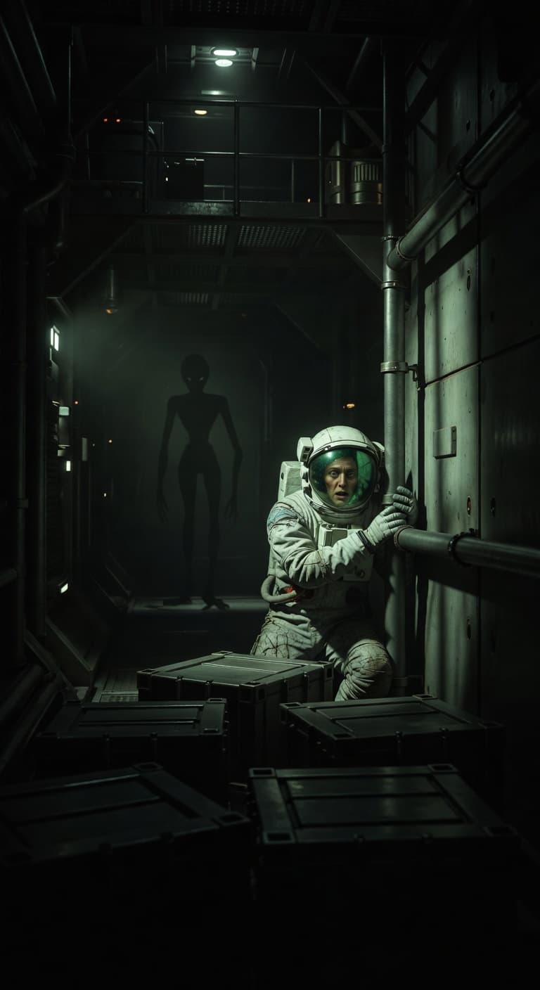 An astronaut cowers behind boxes in a dimly lit, industrial corridor, fear etched on their face. In the shadows behin...