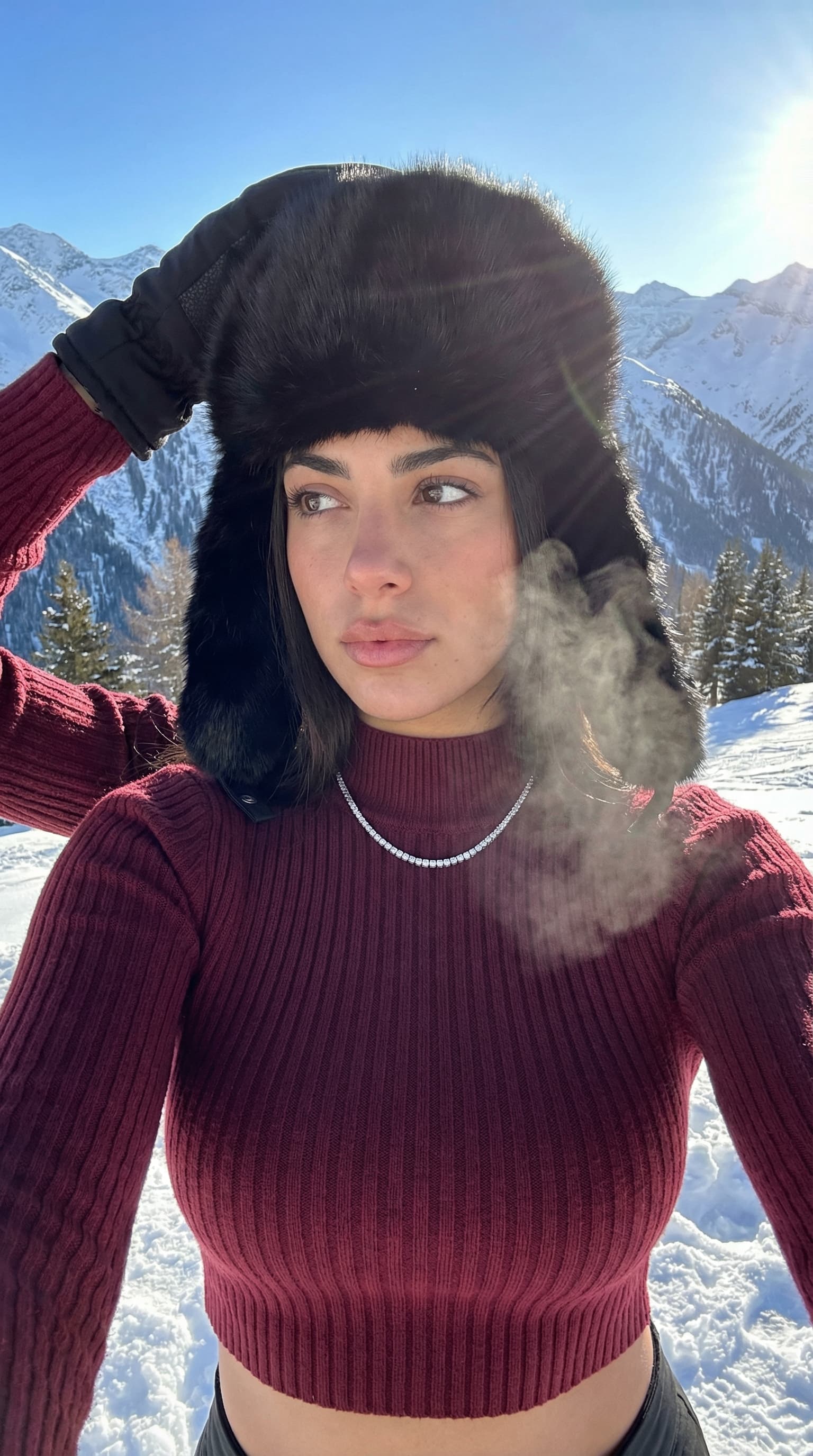 A young woman poses in a snowy mountain landscape, wearing a fur hat and burgundy sweater. The sunlight catches the s...