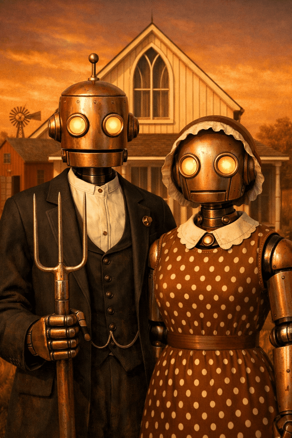 3D robot couple in American Gothic style, male robot in black suit with pitchfor...