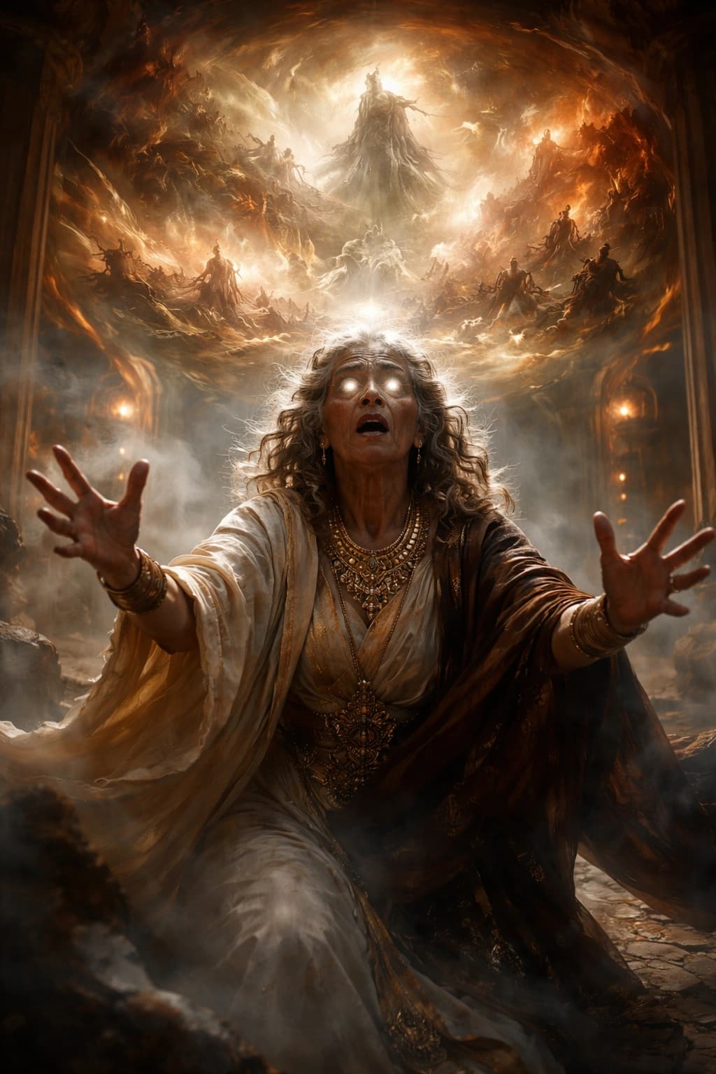 A figure wreathed in divine light kneels in supplication before a turbulent sky filled with otherworldly forms. The d...