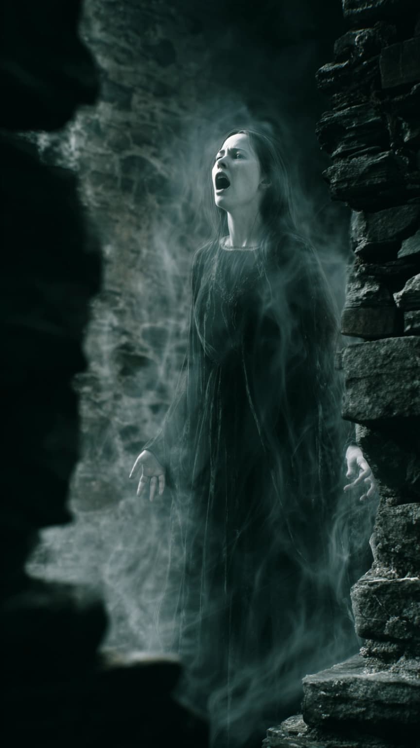 A haunting scene of a ghostly woman wailing in Celtic Ruins, a Banshee Cry - Dea...