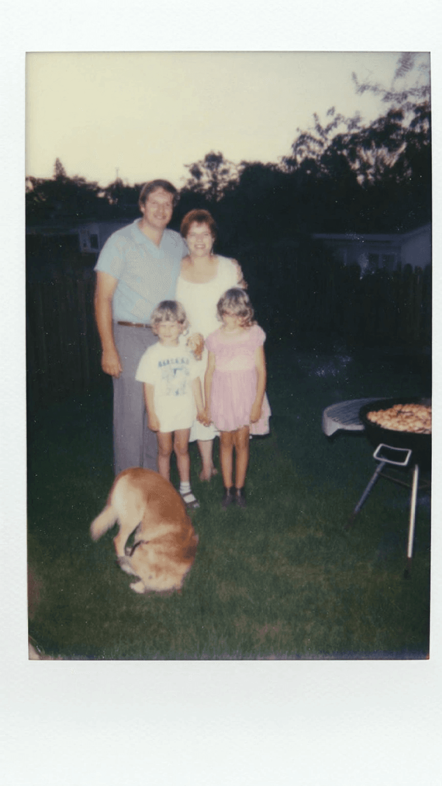 Polaroid family photo of a husband wife and kids in the 1980s in their backyard ...