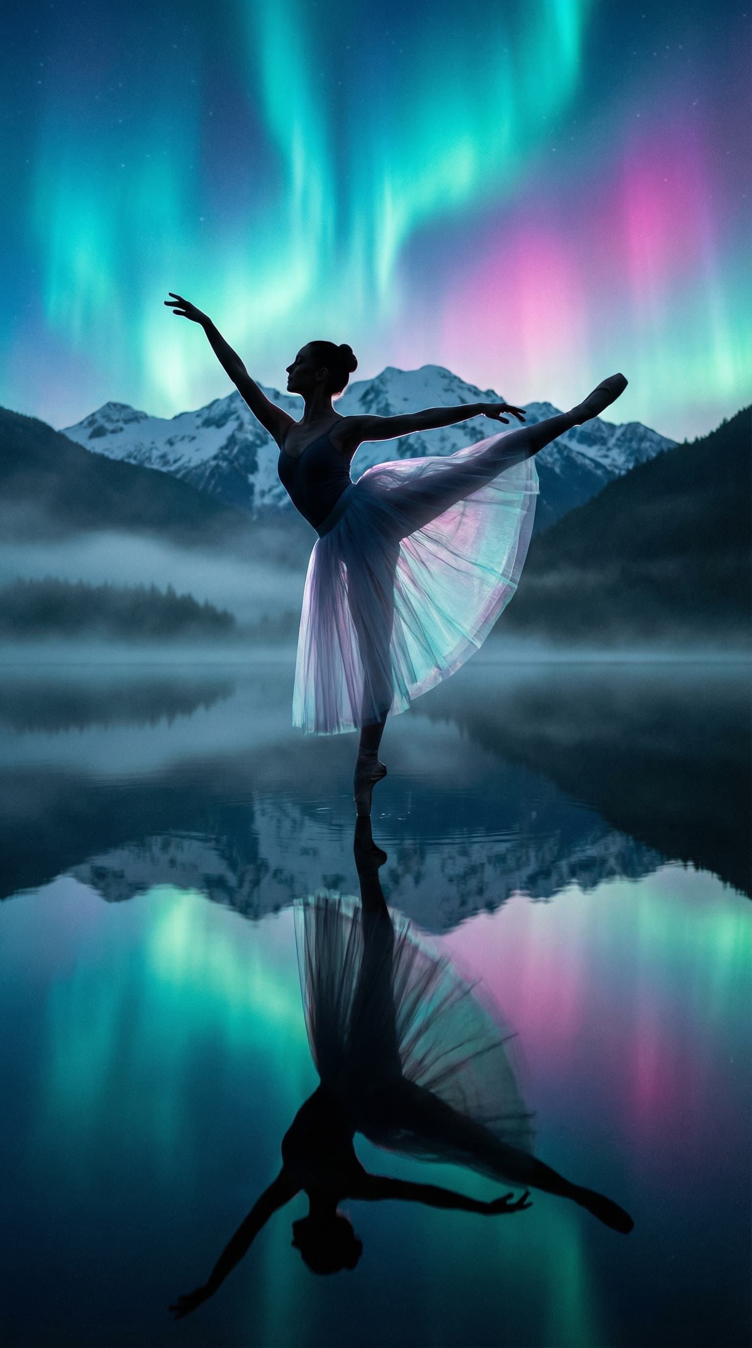 A ballerina in silhouette balances en pointe on a misty lake under the aurora borealis. The dancer and the mountainou...