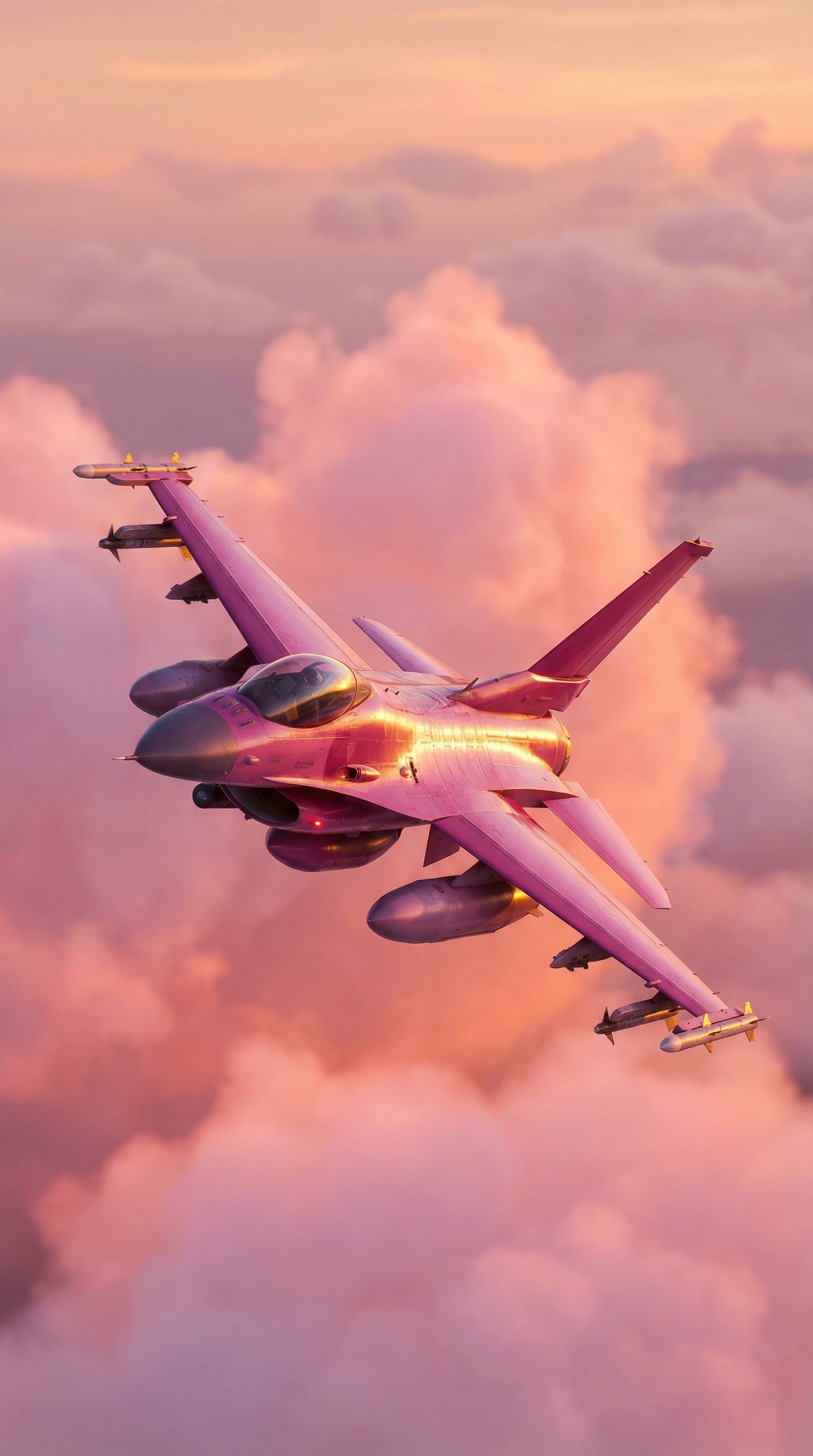 A sleek fighter jet soars through a cotton-candy sky. Bathed in the warm hues of sunset, the scene evokes a sense of ...
