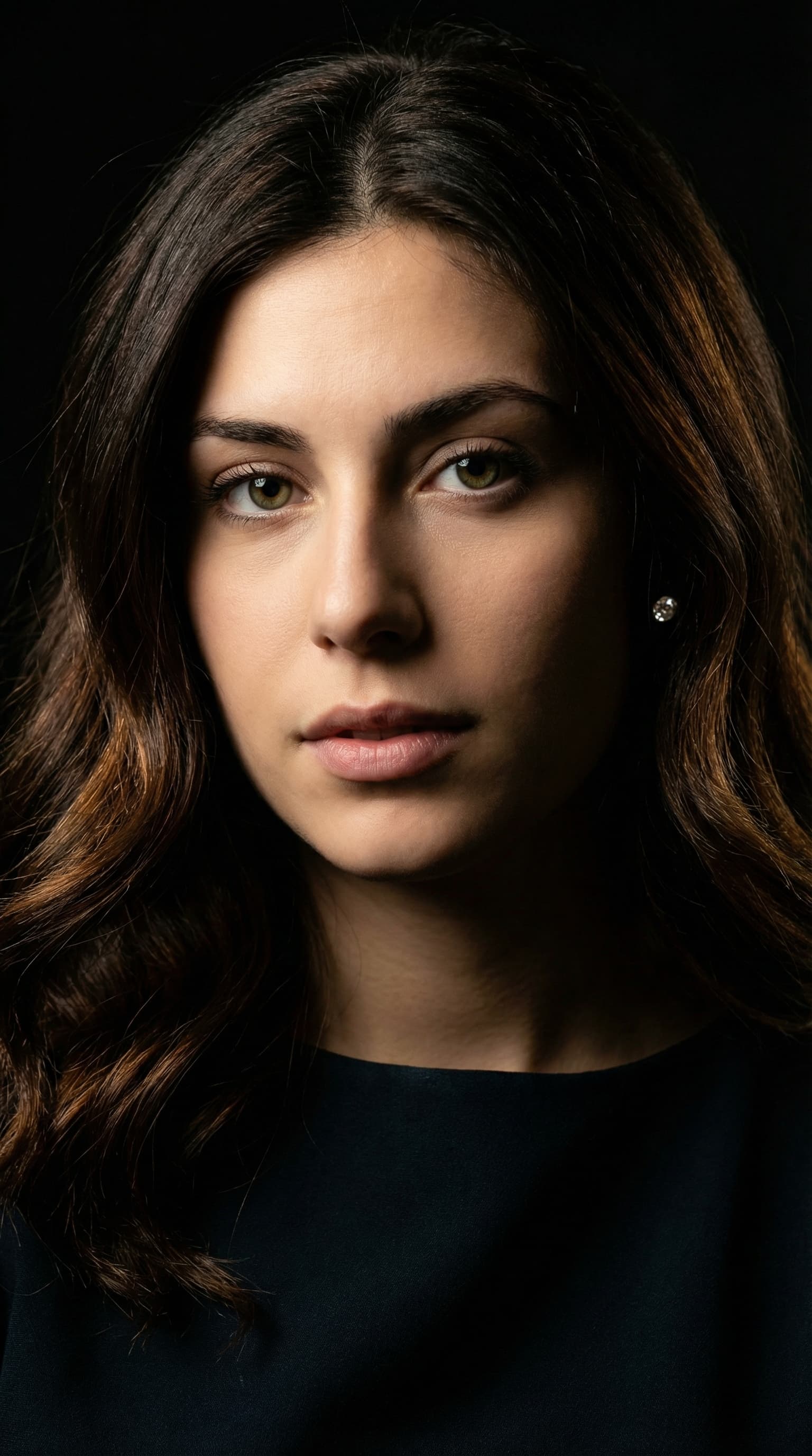 A portrait of a young woman bathed in soft light against a dark background. Her gaze is direct and serene, reminiscen...