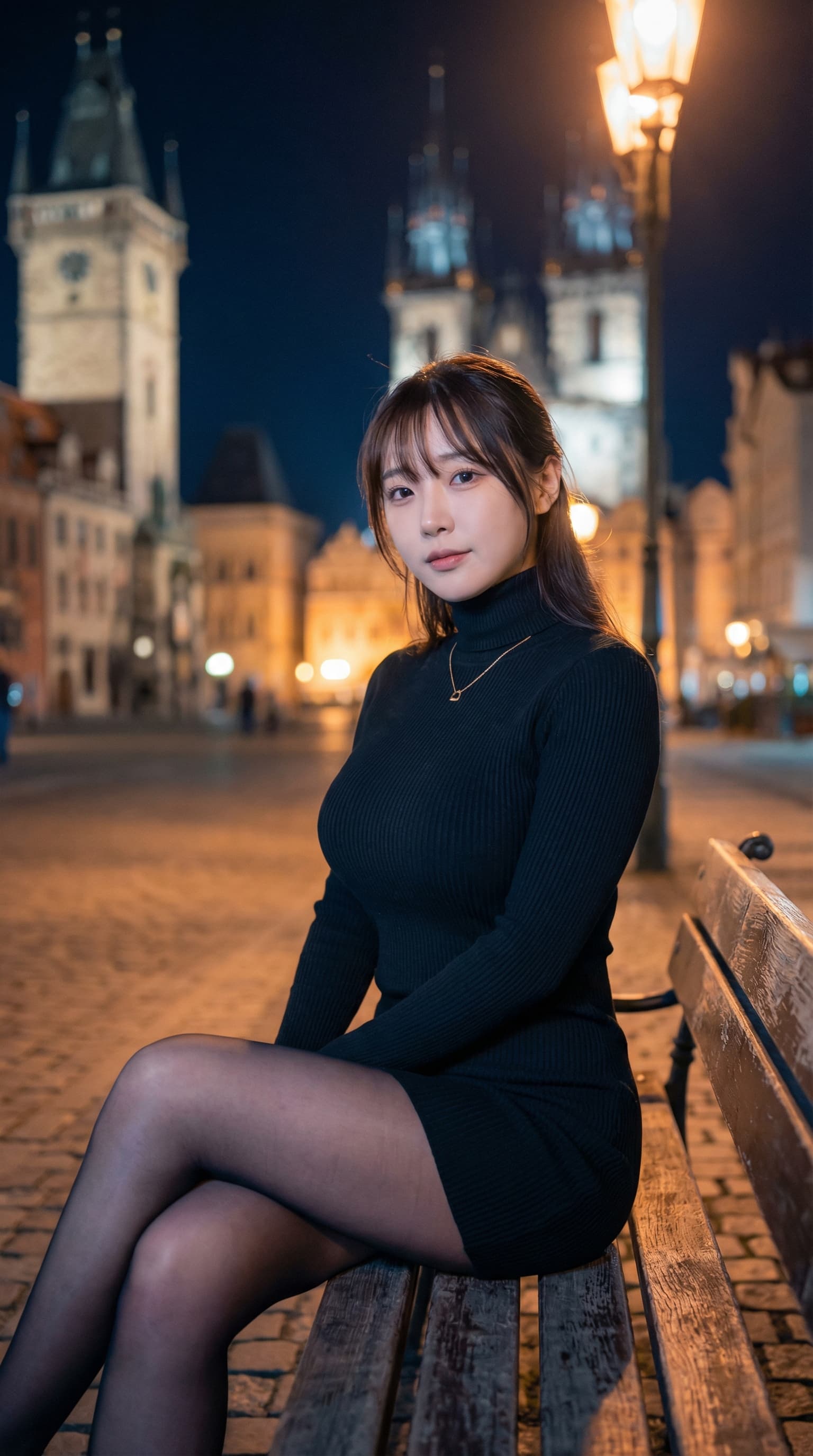 A figure in black sits on a bench, illuminated by a warm glow against the backdrop of a historic European square at n...