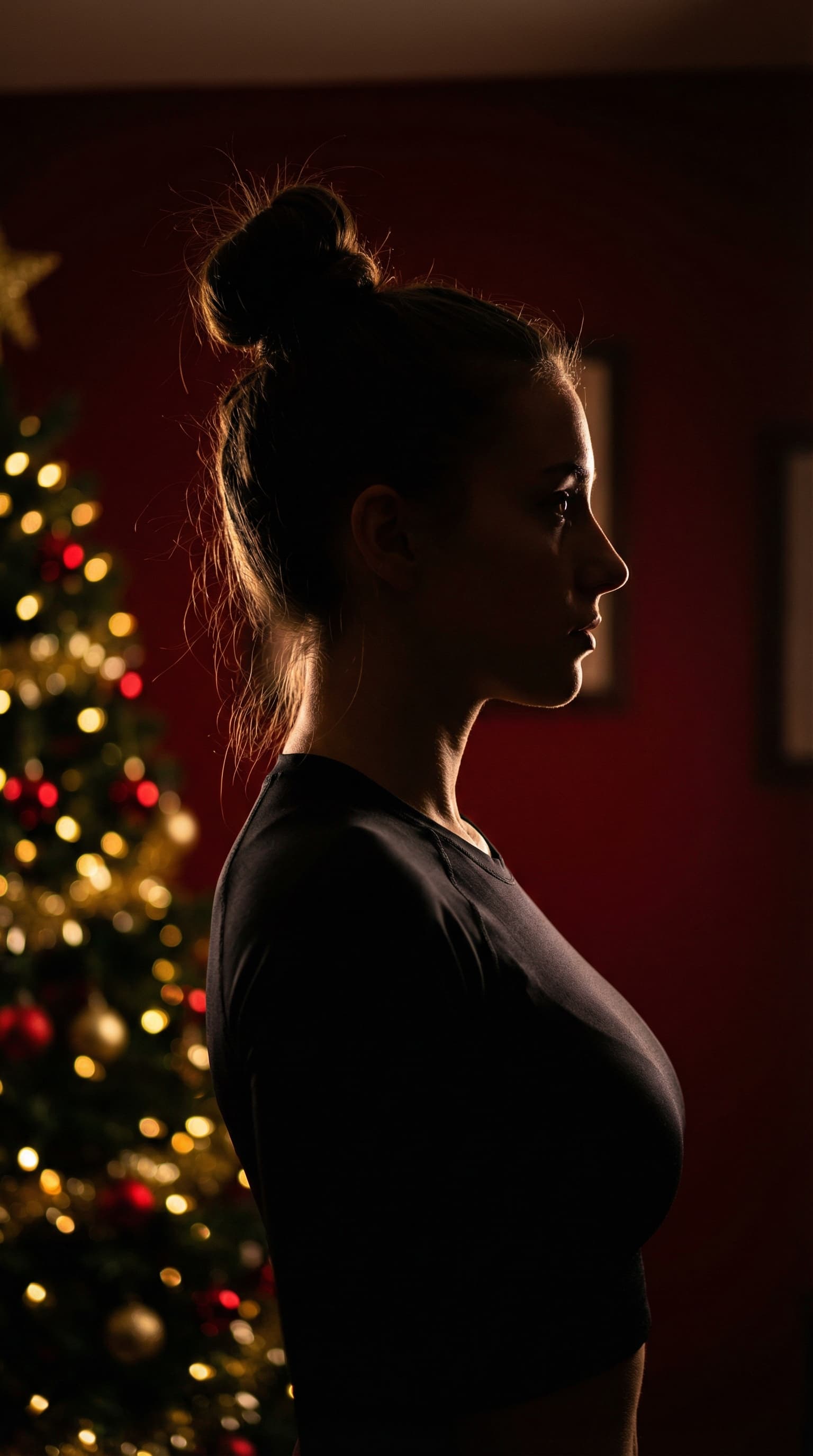 A woman's profile is silhouetted against the warm glow of a Christmas tree. The scene evokes a sense of quiet anticip...