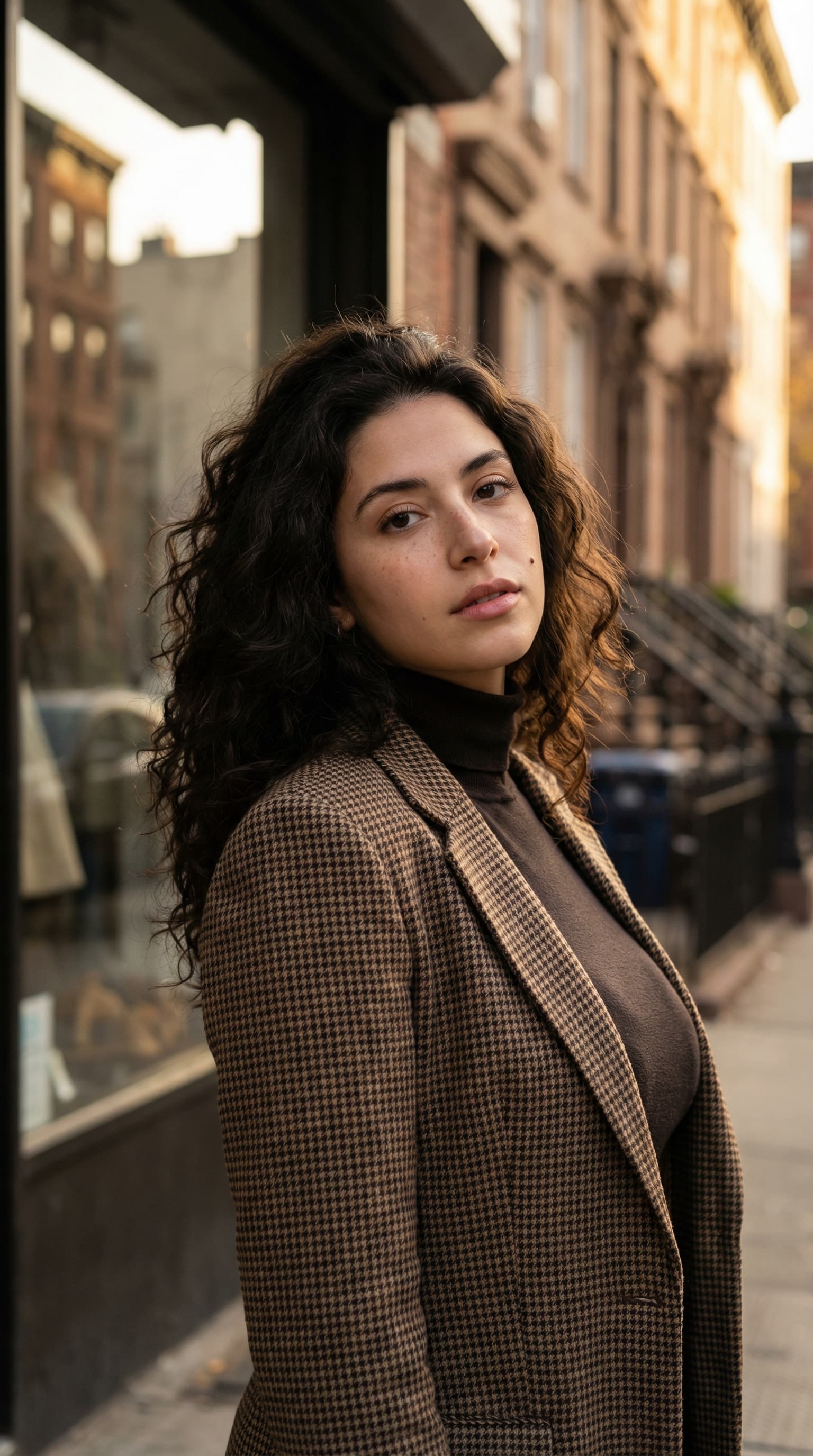 A young woman stands in a city street, gazing directly at the viewer with a slight tilt of her head. The warm light o...
