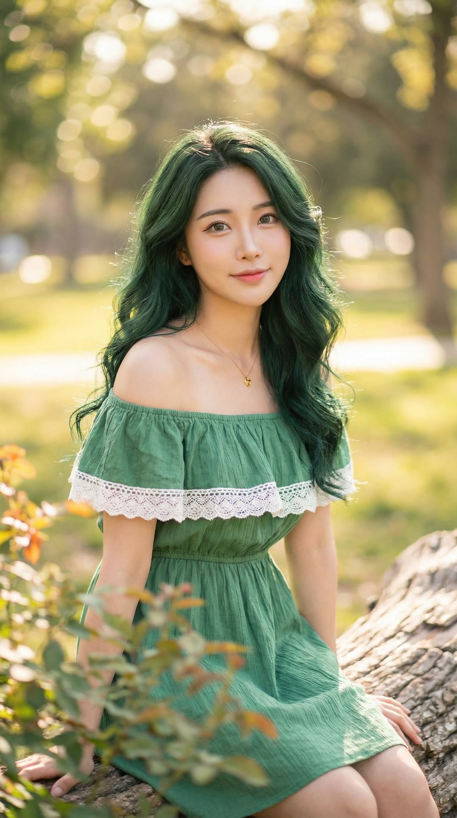 A young woman with striking green hair sits serenely upon a fallen log. Her simple green dress and the dappled sunlig...