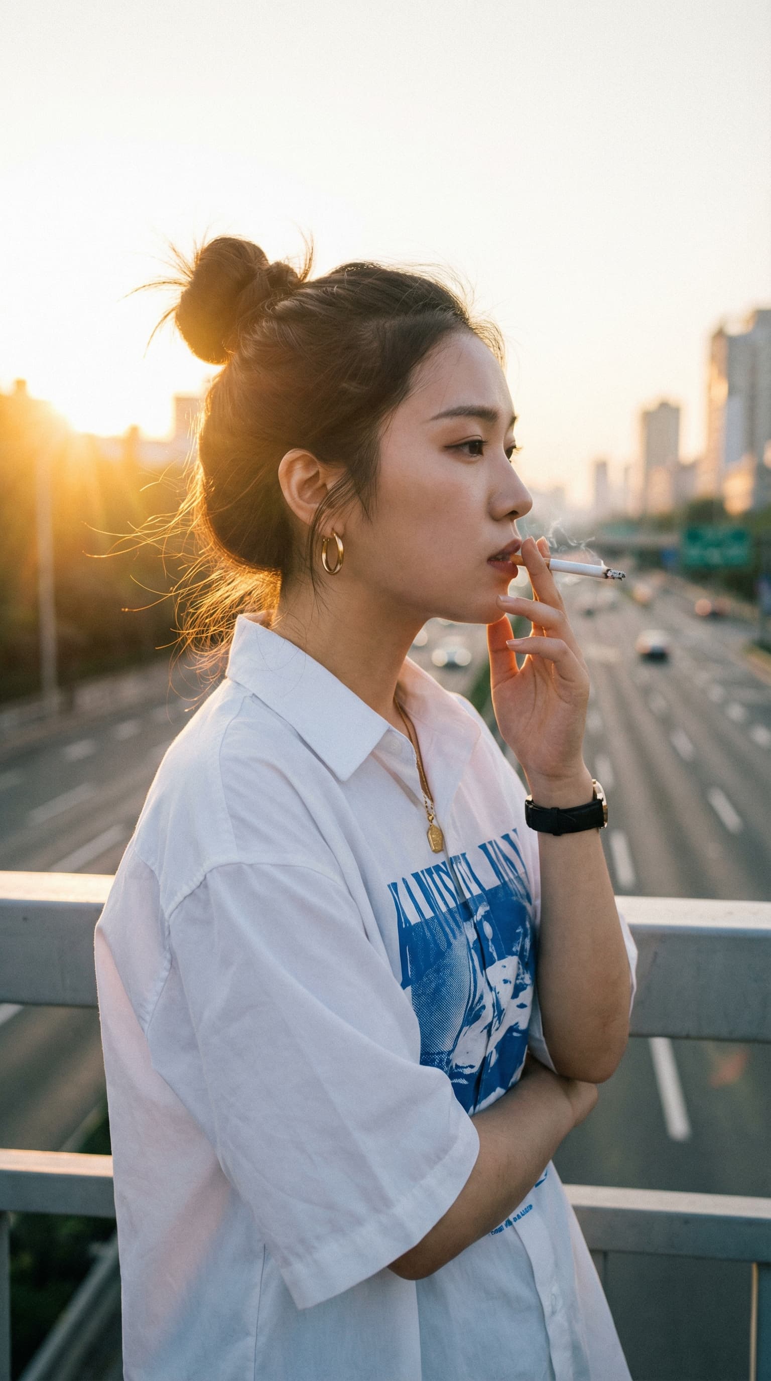 A young woman stands in profile, smoking a cigarette against the backdrop of a city highway at sunset. The golden lig...