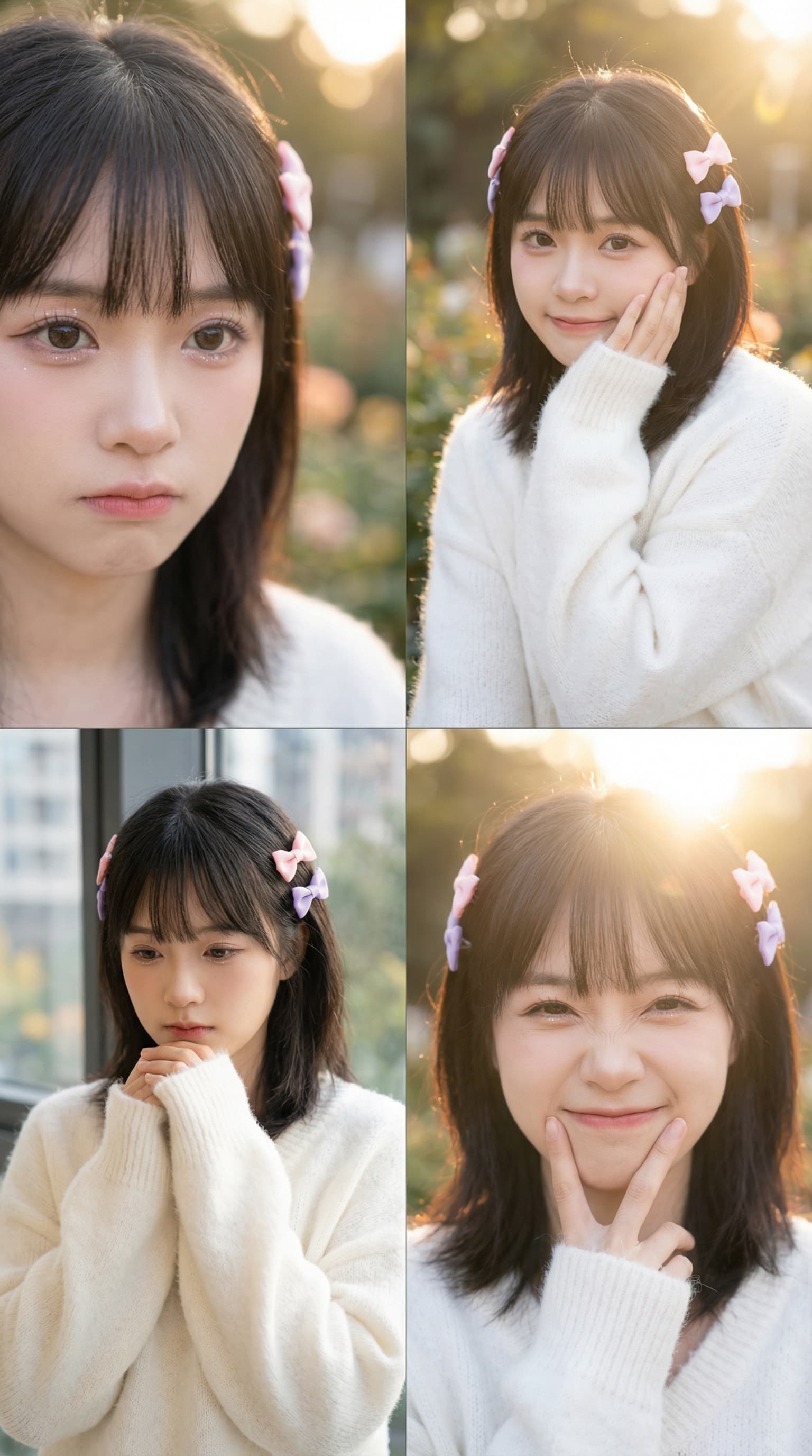 This portrait series captures a young woman in moments of varying emotion, from thoughtful reserve to cheerful exuber...