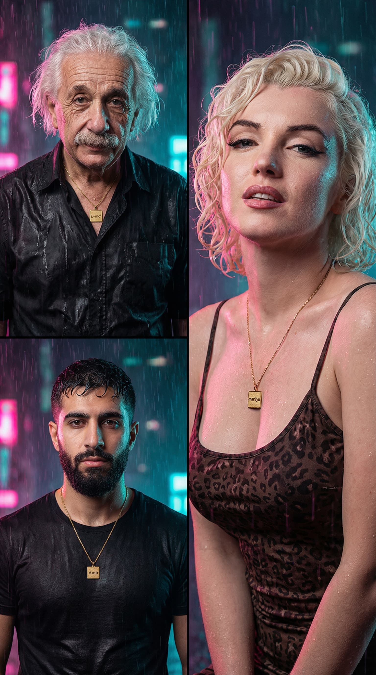 This photorealistic triptych places three subjects against a futuristic, neon-lit cityscape in the rain. Each figure,...