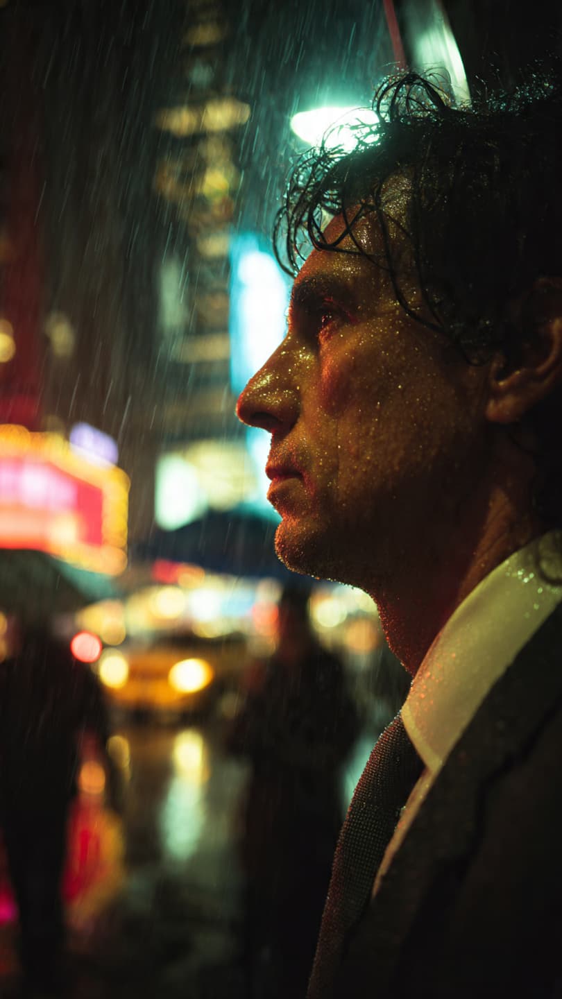 Man in a suit, standing in the rain. Pensive expression. Wet hair sticking to hi...