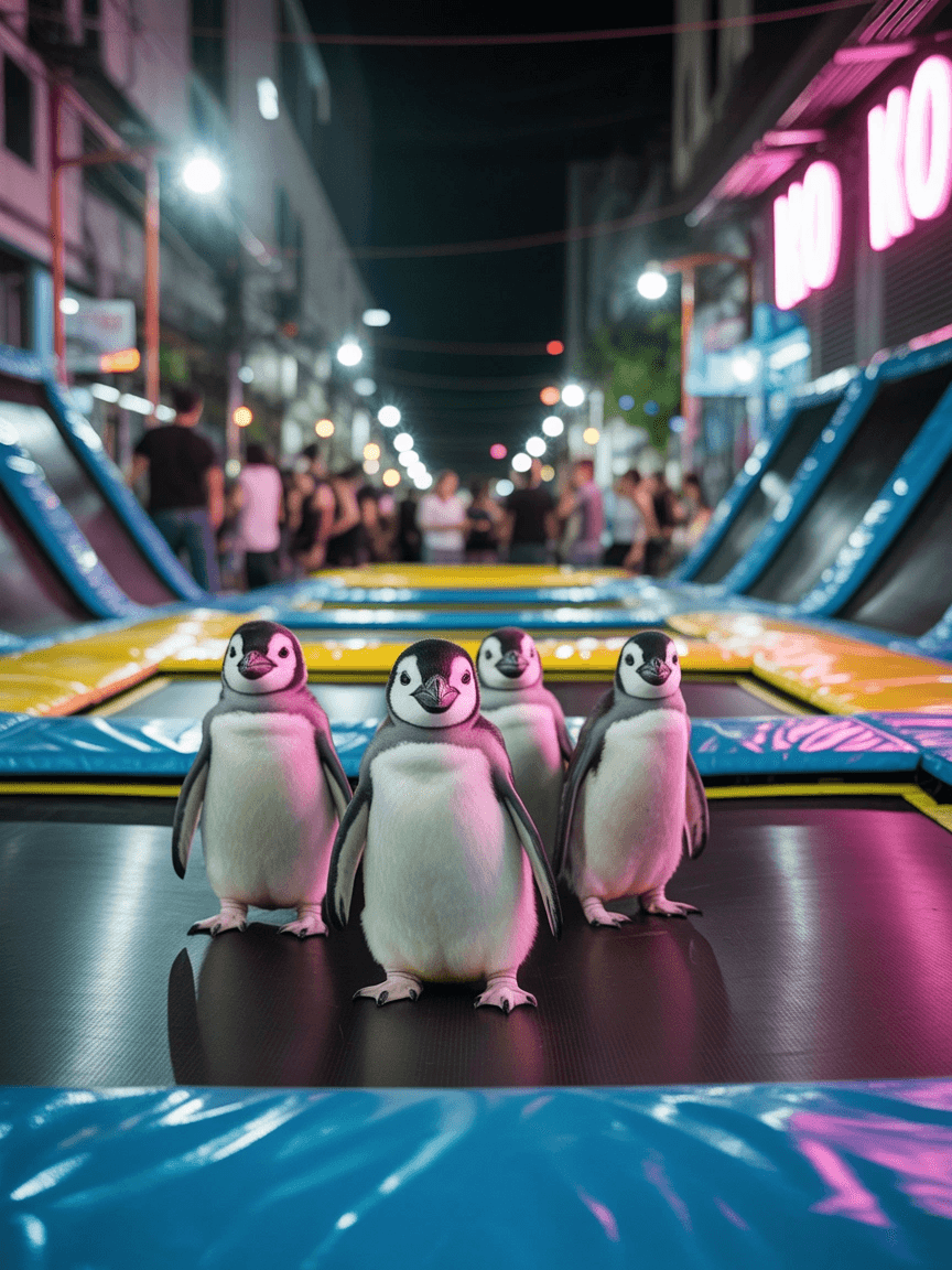 A group of baby penguins in a trampoline park, having the time of their lives, 8...
