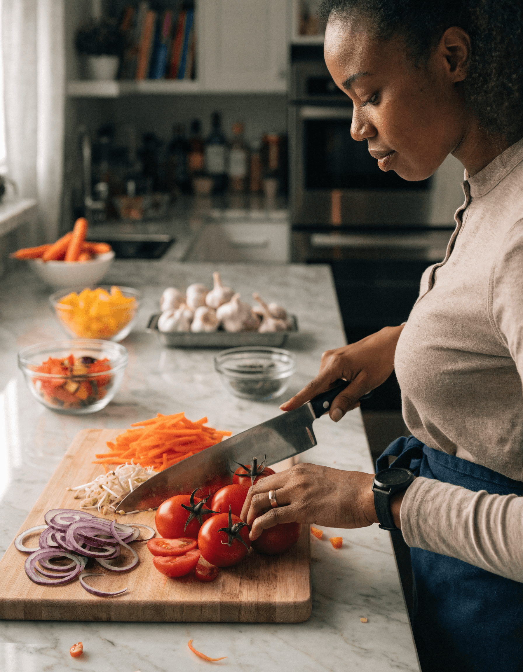 In this intimate kitchen scene, a woman thoughtfully prepares fresh vegetables. Warm, natural lighting illuminates th...