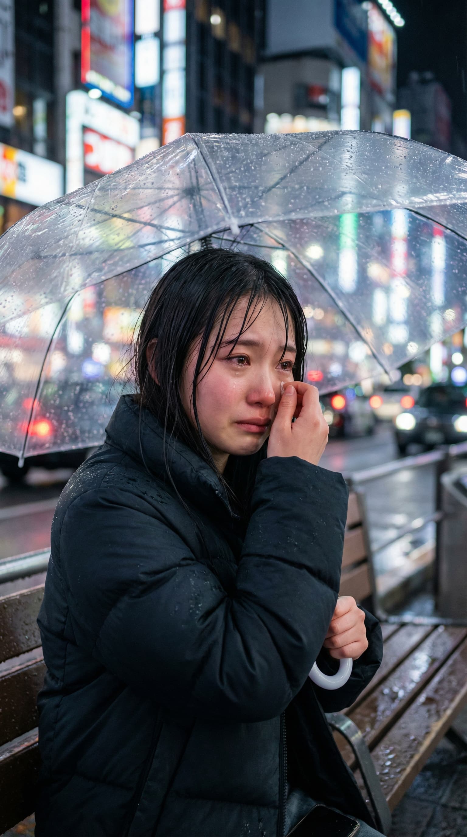 This poignant image captures a young woman crying on a rainy night in a bustling city. The neon lights blur behind he...
