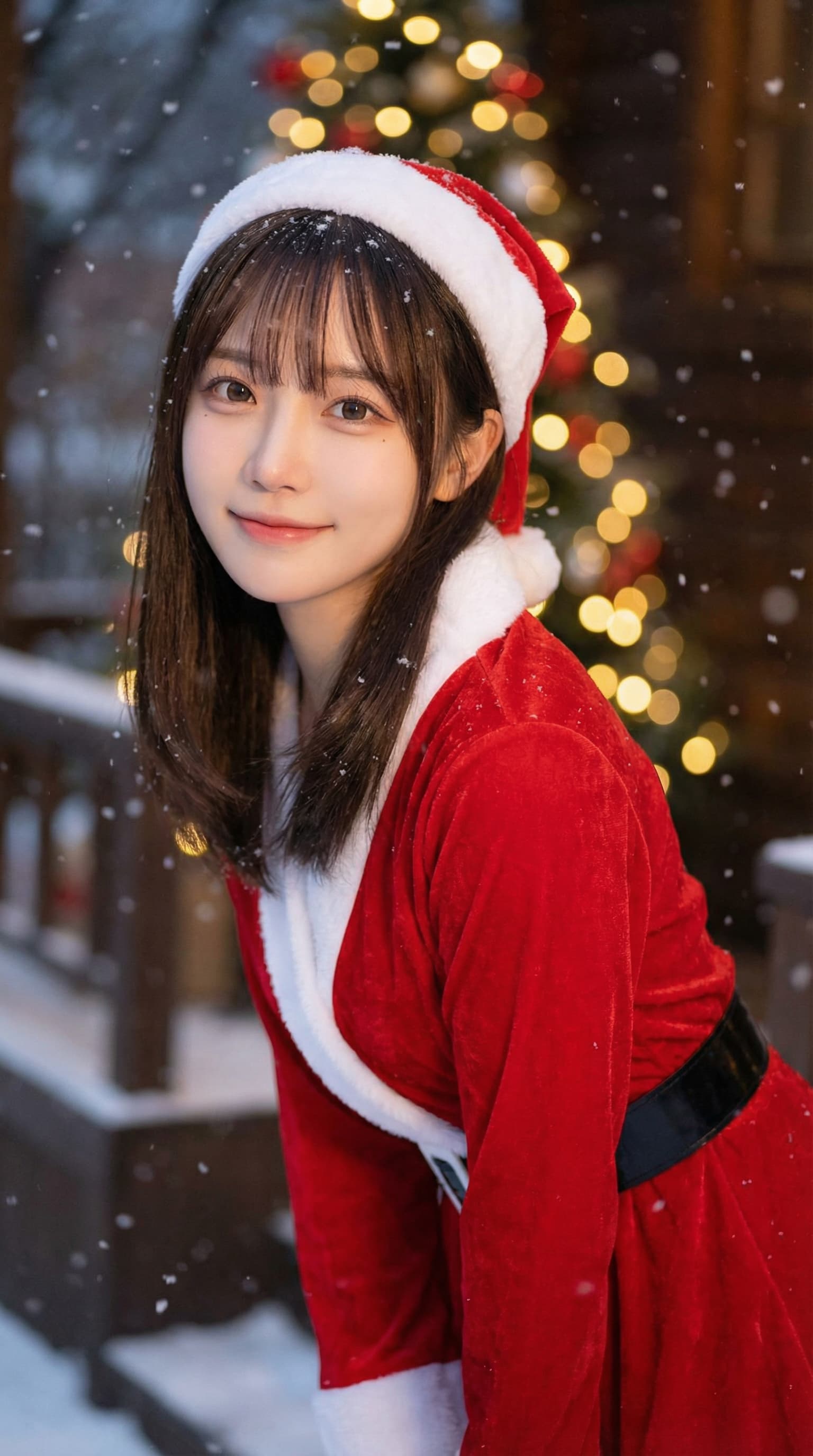 A young woman in a Santa suit smiles gently as snow falls around her. A warmly lit Christmas tree blurs in the backgr...