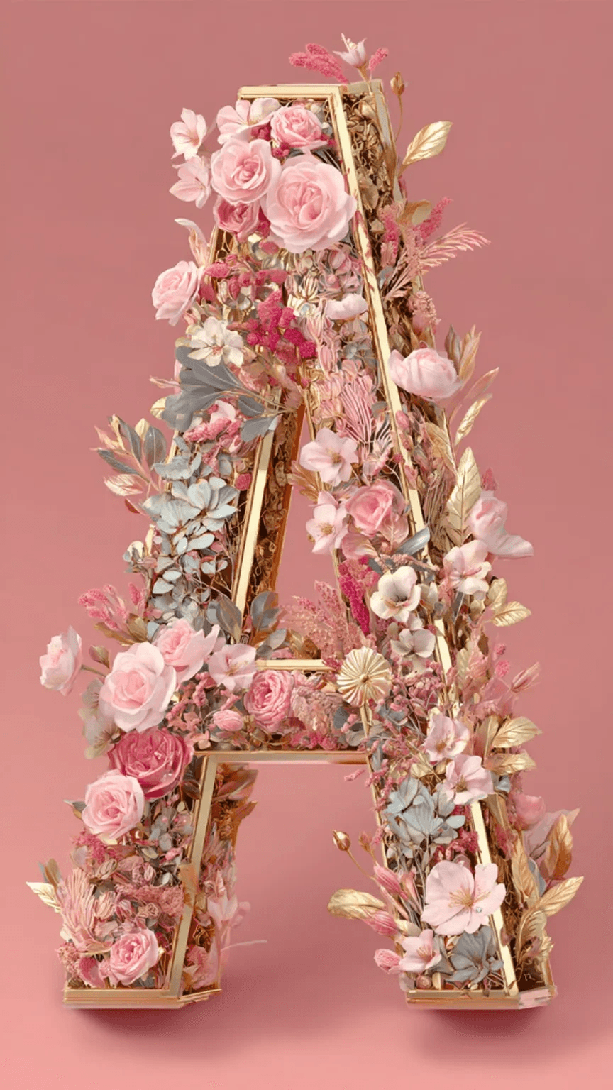 A floral letter "A", isometric design, dreamy pastel color, roses and leaves, so...