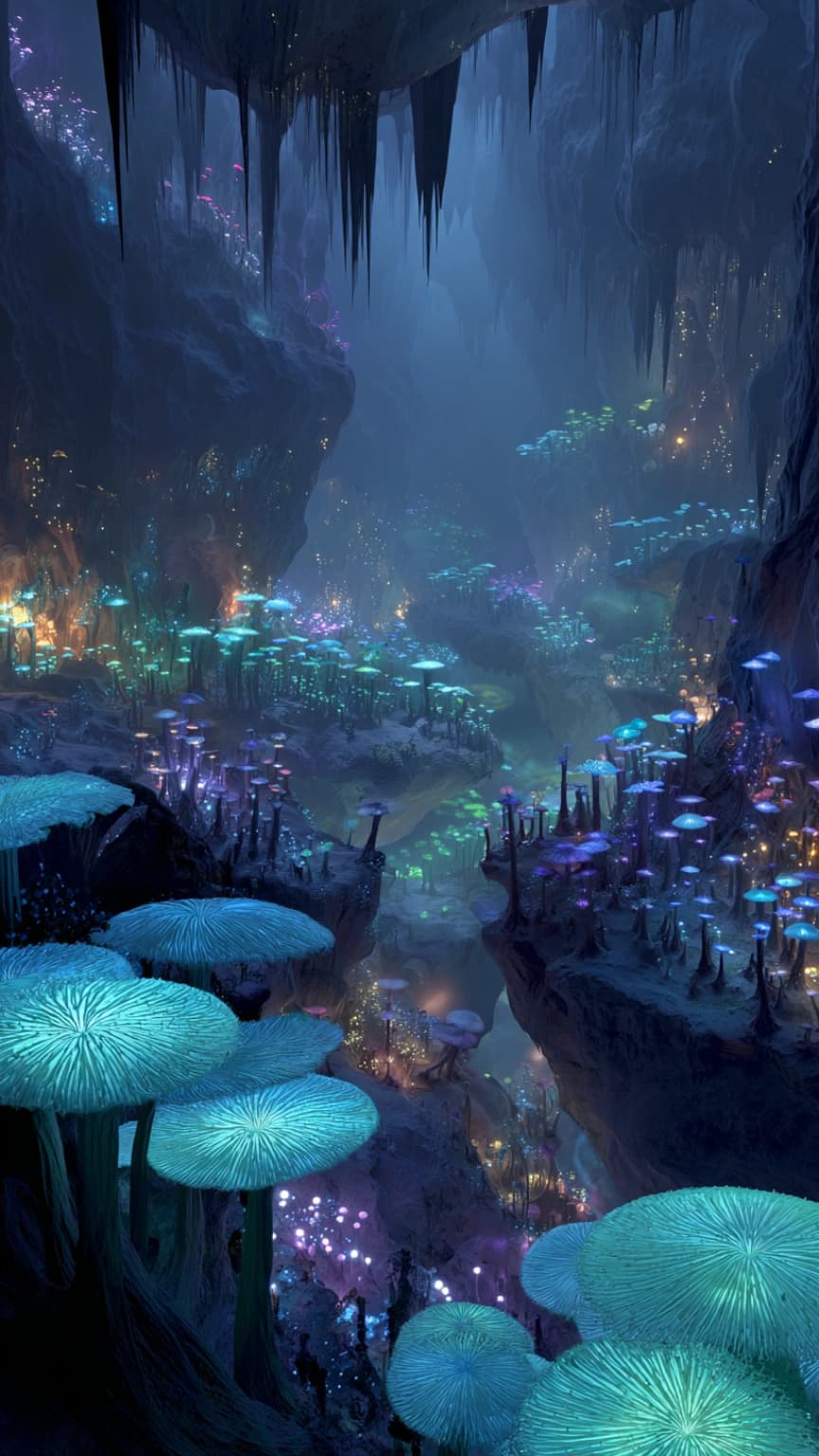 A surreal, vertical establishing shot of a deep underground cavern on a mysterio...