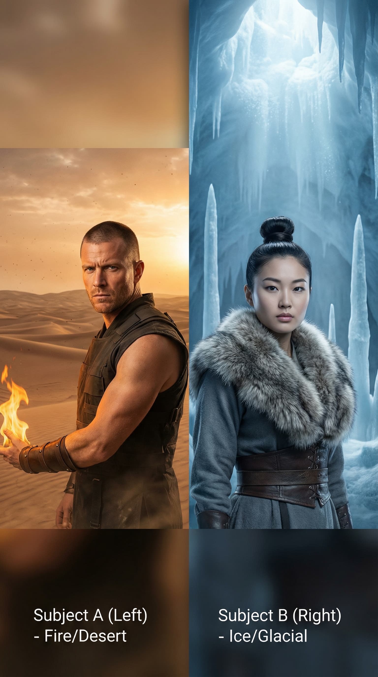This split-panel image contrasts fire and ice, featuring a muscular man holding a flame against a desert landscape an...