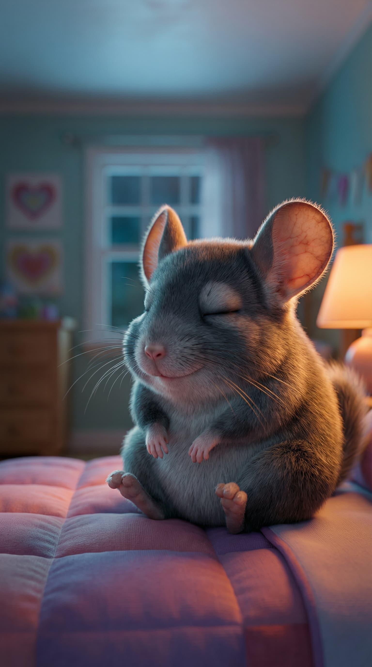 A fluffy chinchilla sits contentedly on a pink quilted bed, its eyes closed in peaceful repose. The soft lighting of ...