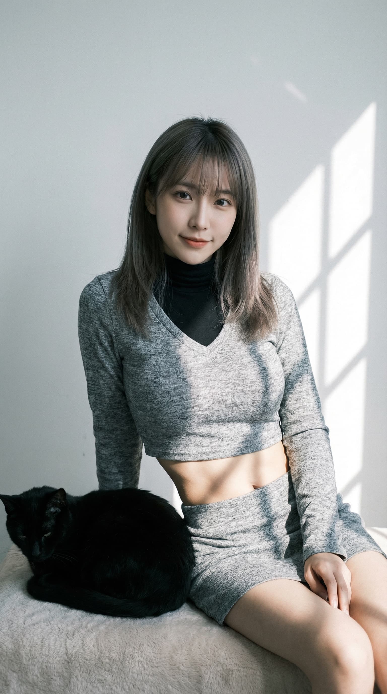 A young woman sits serenely in the sunlight, a black cat nestled beside her. The minimalist composition and soft ligh...