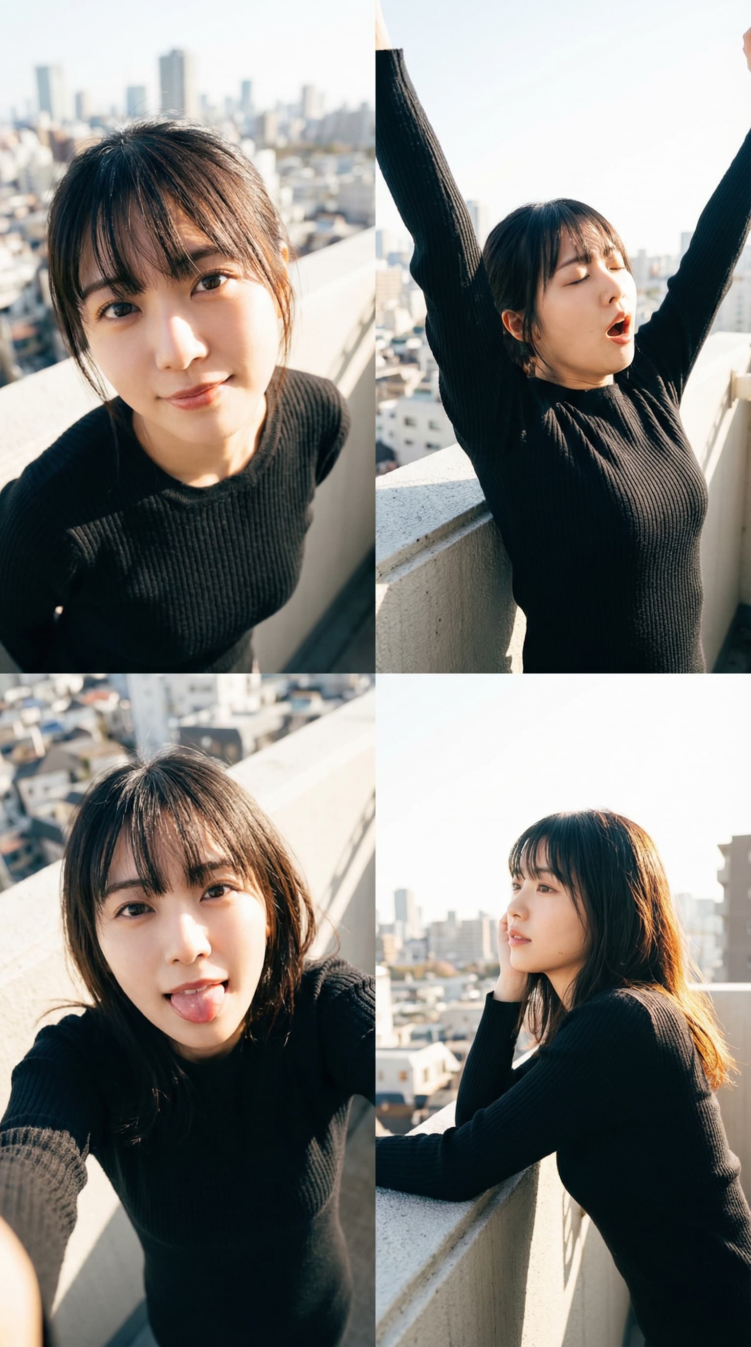 This digital image presents a young woman in four different poses, bathed in bright sunlight on a rooftop overlooking...