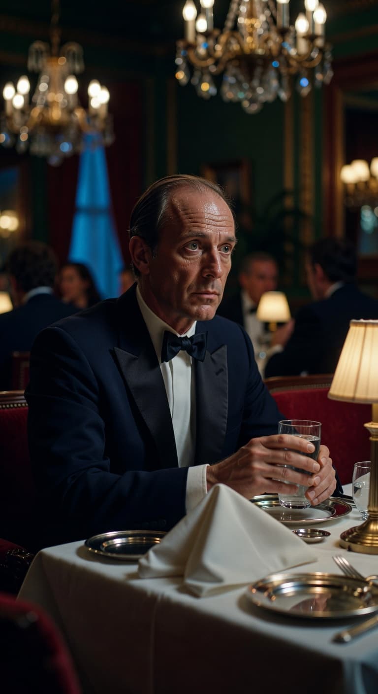 A man in a tuxedo sits alone at a table in a lavish restaurant. The somber mood is enhanced by the warm, muted lighti...