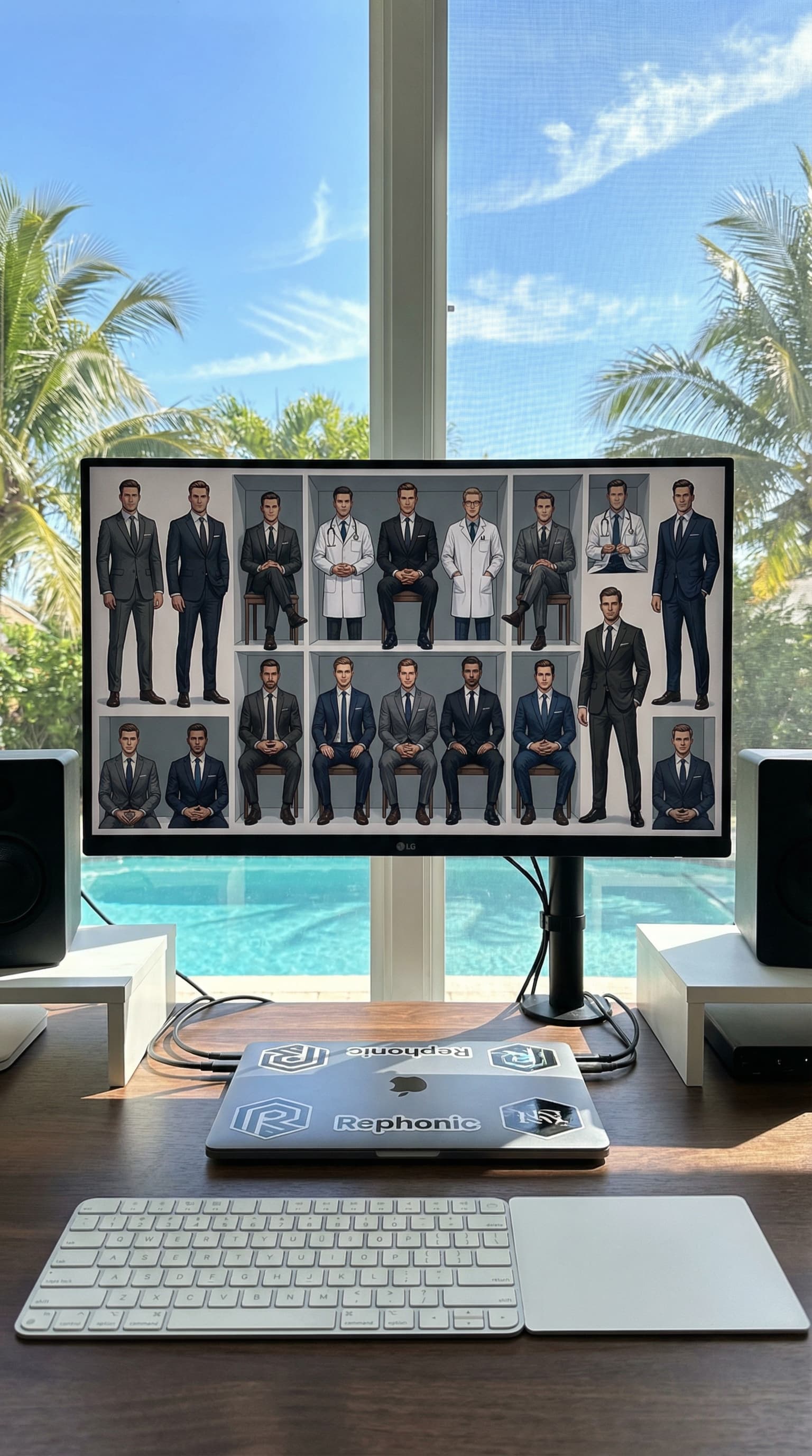 A computer monitor displays an AI-generated grid of portraits featuring various men in suits and doctor's coats, offe...