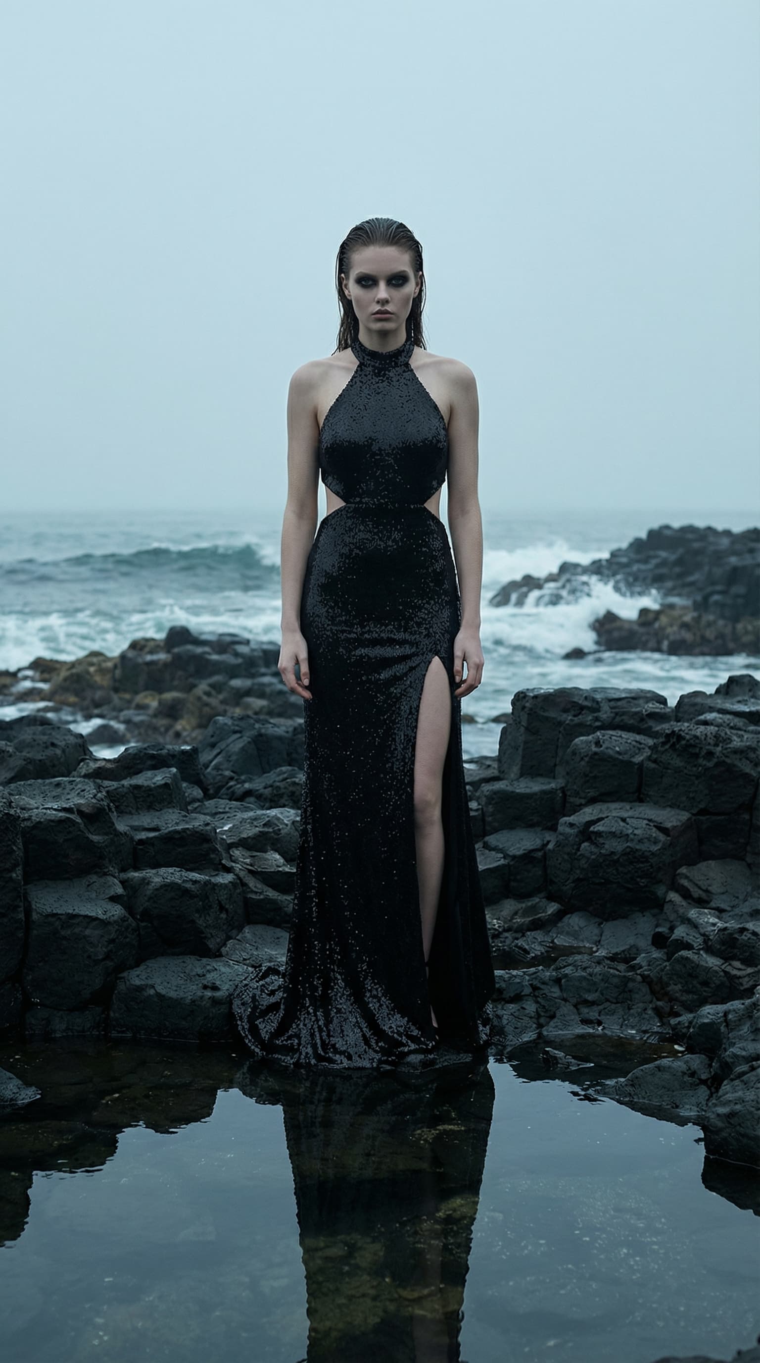 A figure in a black sequined gown stands on a rocky shore, the stormy ocean stretching into a mist-filled horizon. Th...