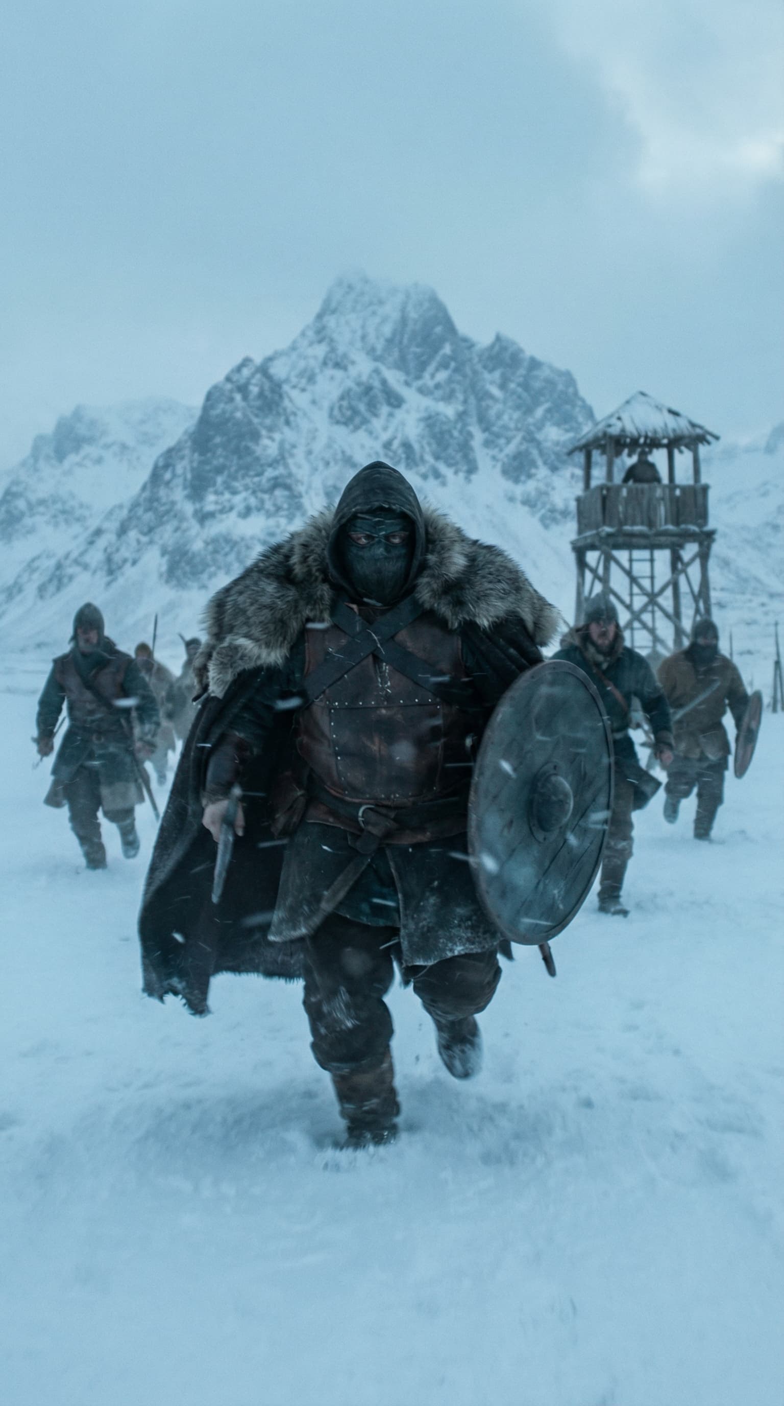 A band of warriors in medieval garb charges forward through deep snow. The stark winter landscape and ominous mountai...