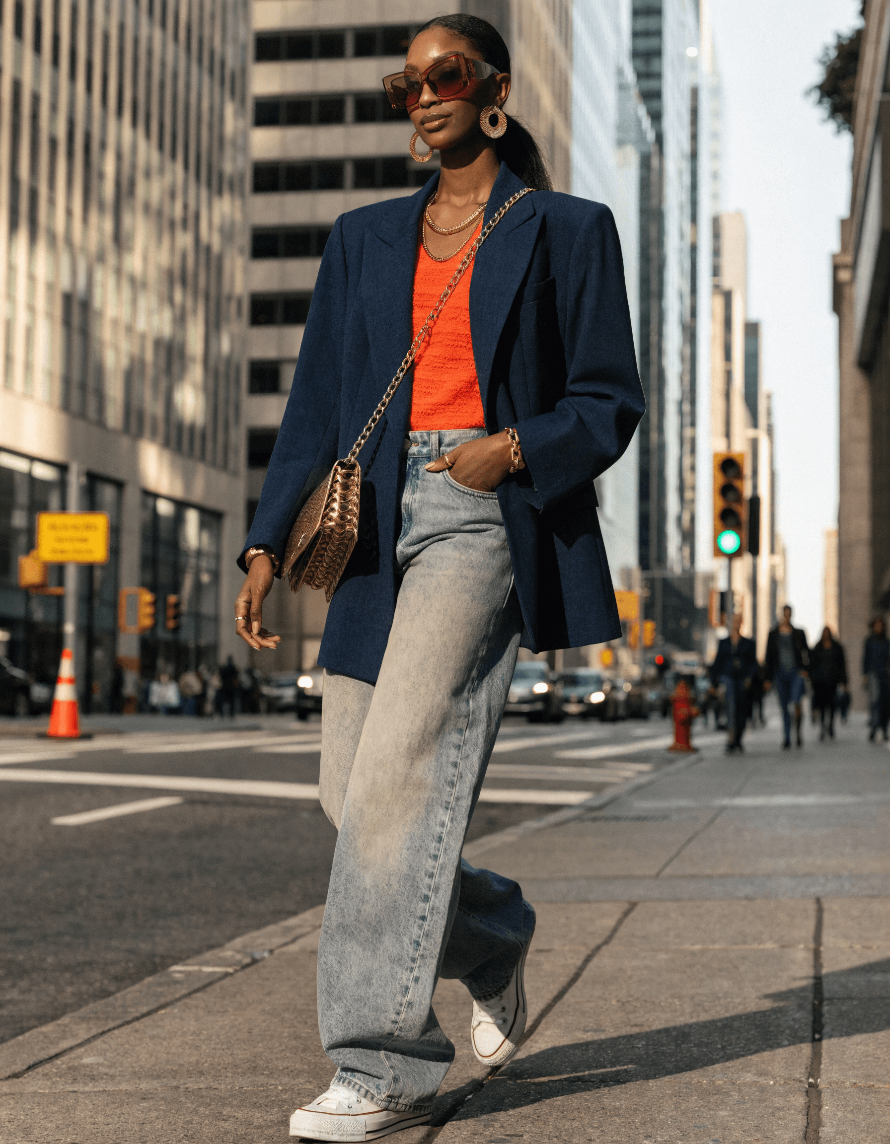 A stylish woman strides confidently across a city street, sunlight glinting off her gold accessories. Her oversized b...