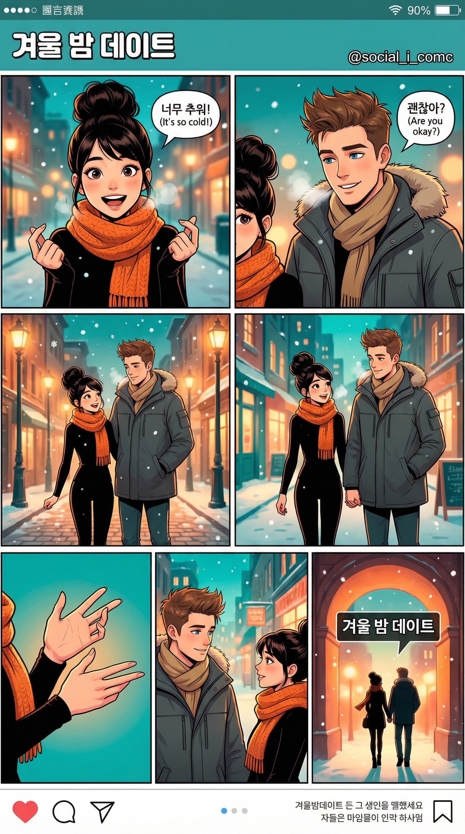 This AI-generated artwork depicts a comic-style sequence of a young couple on a snowy winter date. The soft, diffused...