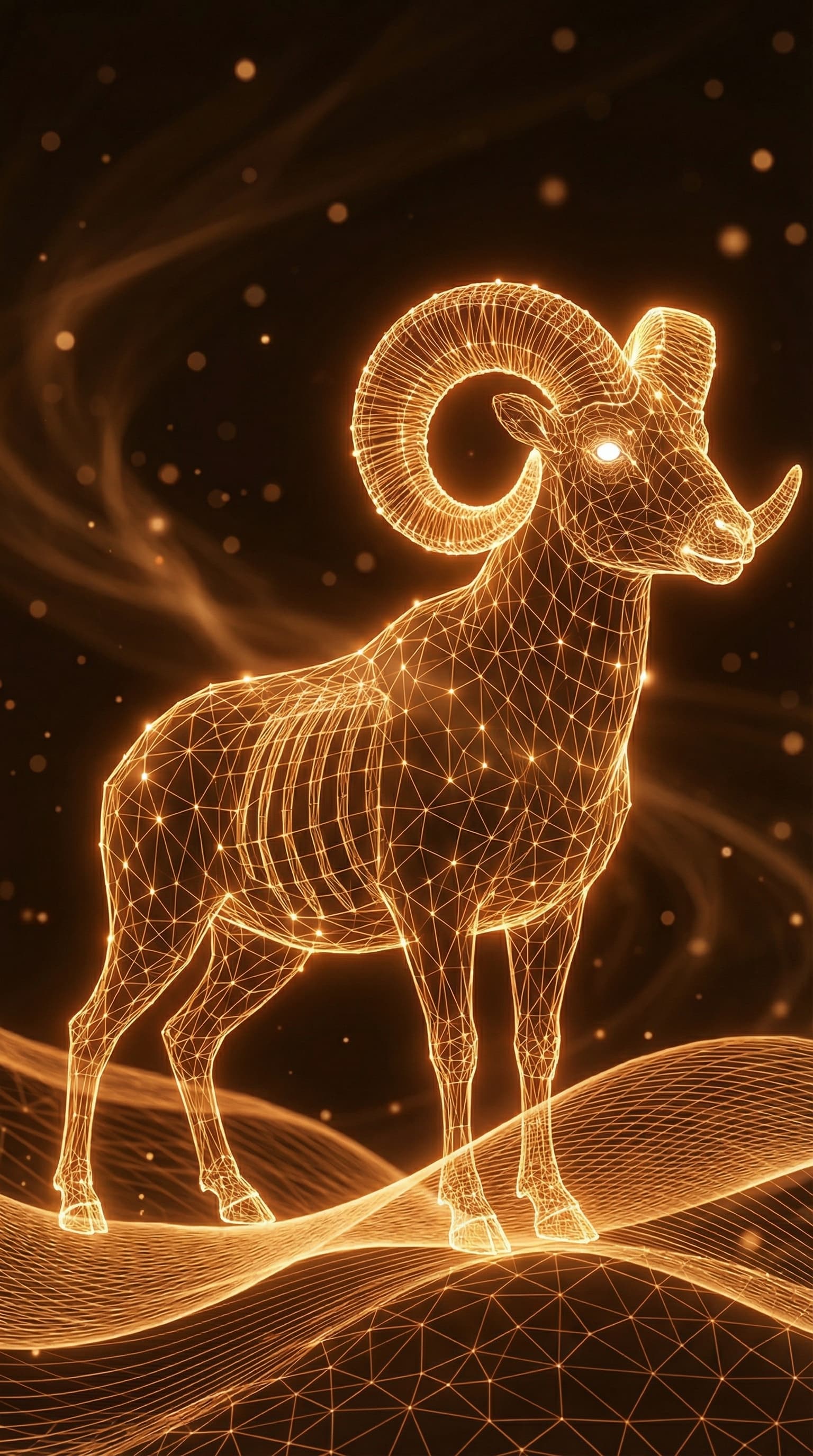 A ram is rendered as a glowing, golden wireframe against a dark, ethereal background. The image evokes a sense of fut...