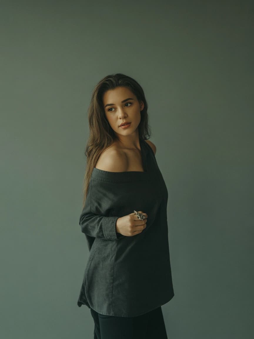 A young woman in an off-the-shoulder top gazes thoughtfully to her left against a muted green background. The image h...