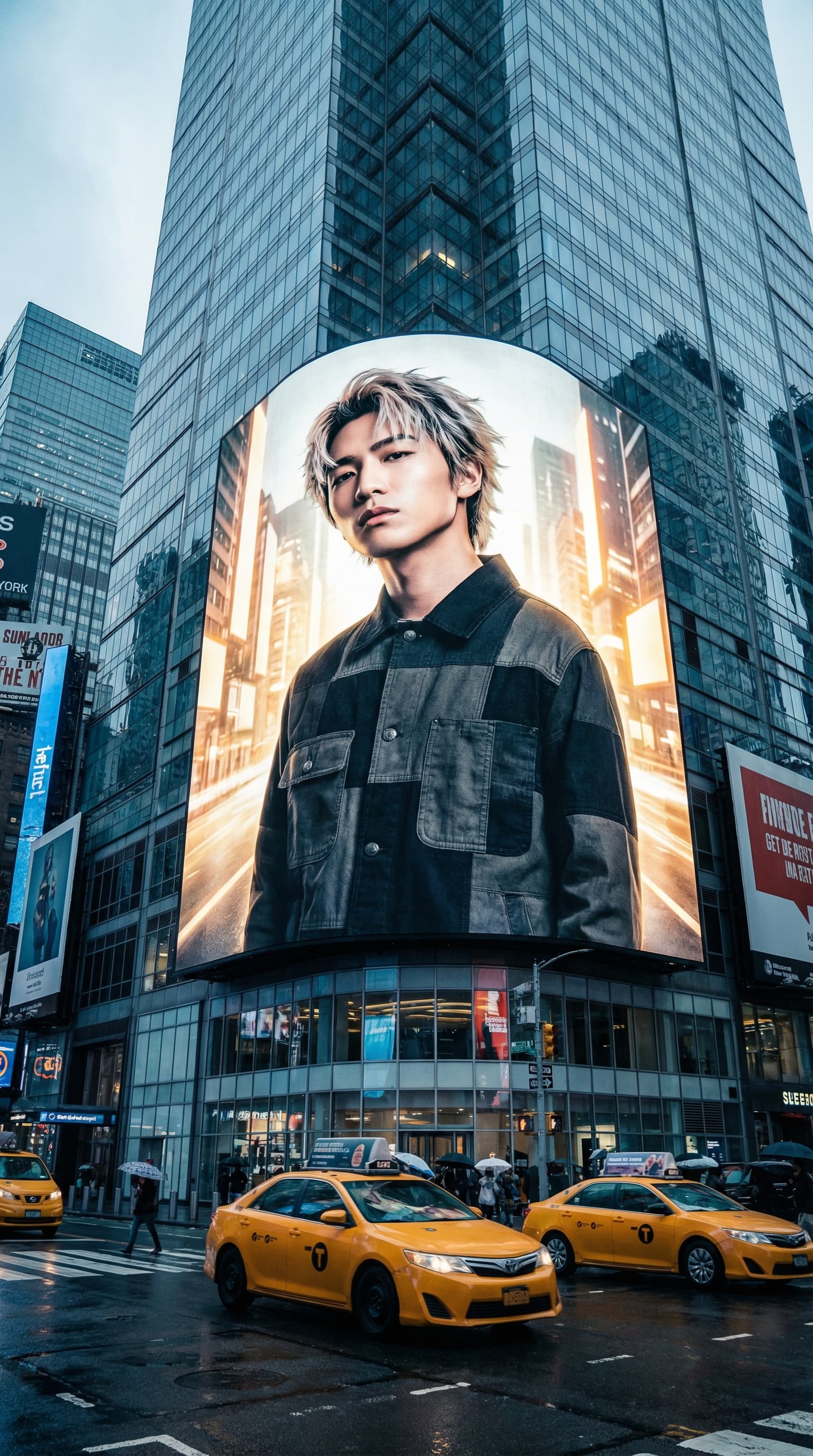 This artwork depicts a young man as a giant advertisement in a rain-slicked Times Square, dwarfing the city below. Th...