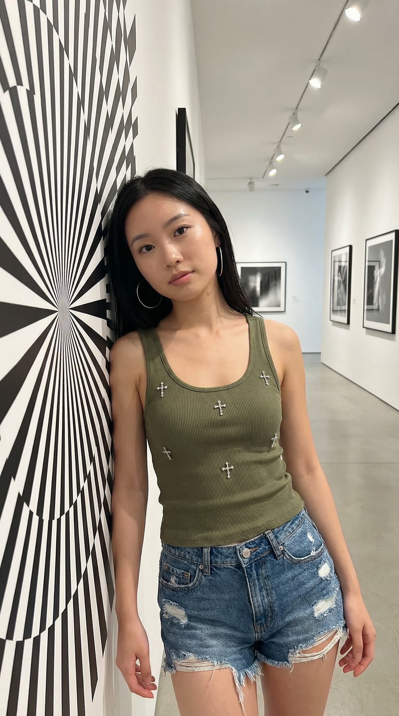 A young woman leans against a wall bearing a stark, black-and-white op-art design. The setting appears to be a contem...