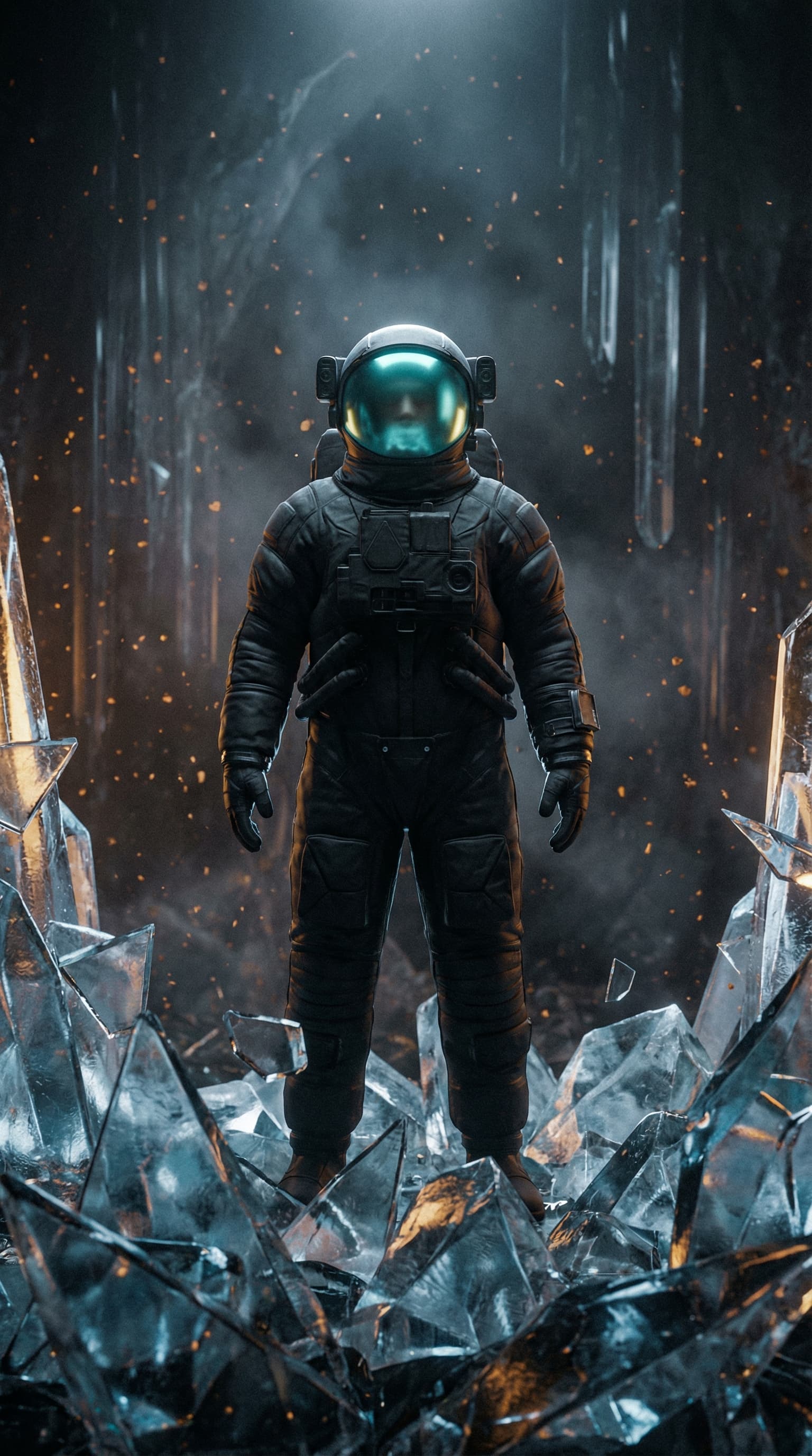 An astronaut stands amidst shards of luminous crystals, illuminated by an ethereal glow. The figure's stoic pose and ...