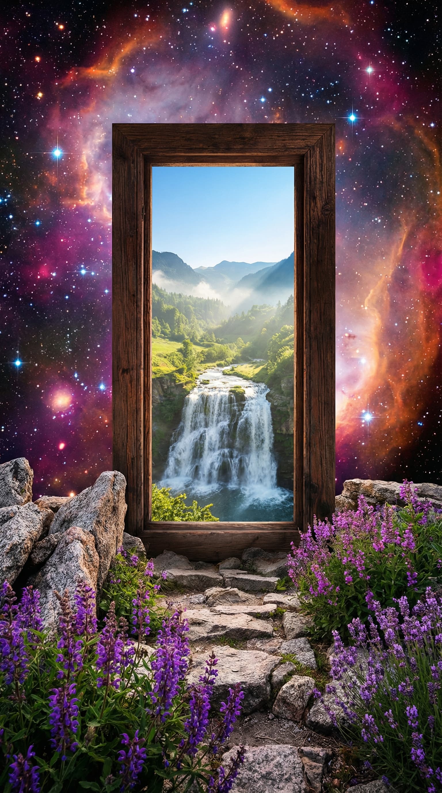 A rustic wooden frame offers a glimpse into a verdant landscape with a cascading waterfall, contrasting sharply with ...