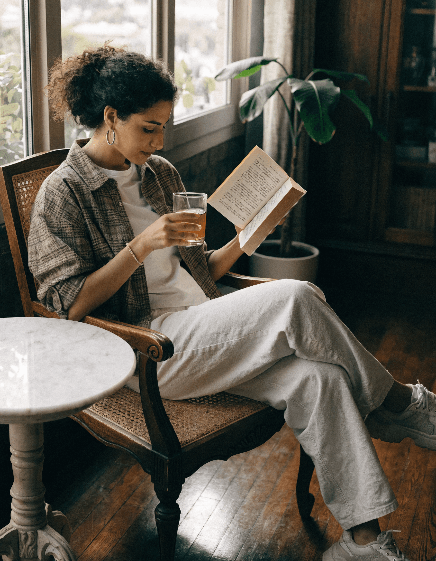 A young woman sits in a sun-drenched room, absorbed in a book and a glass of tea. The soft light and warm tones evoke...