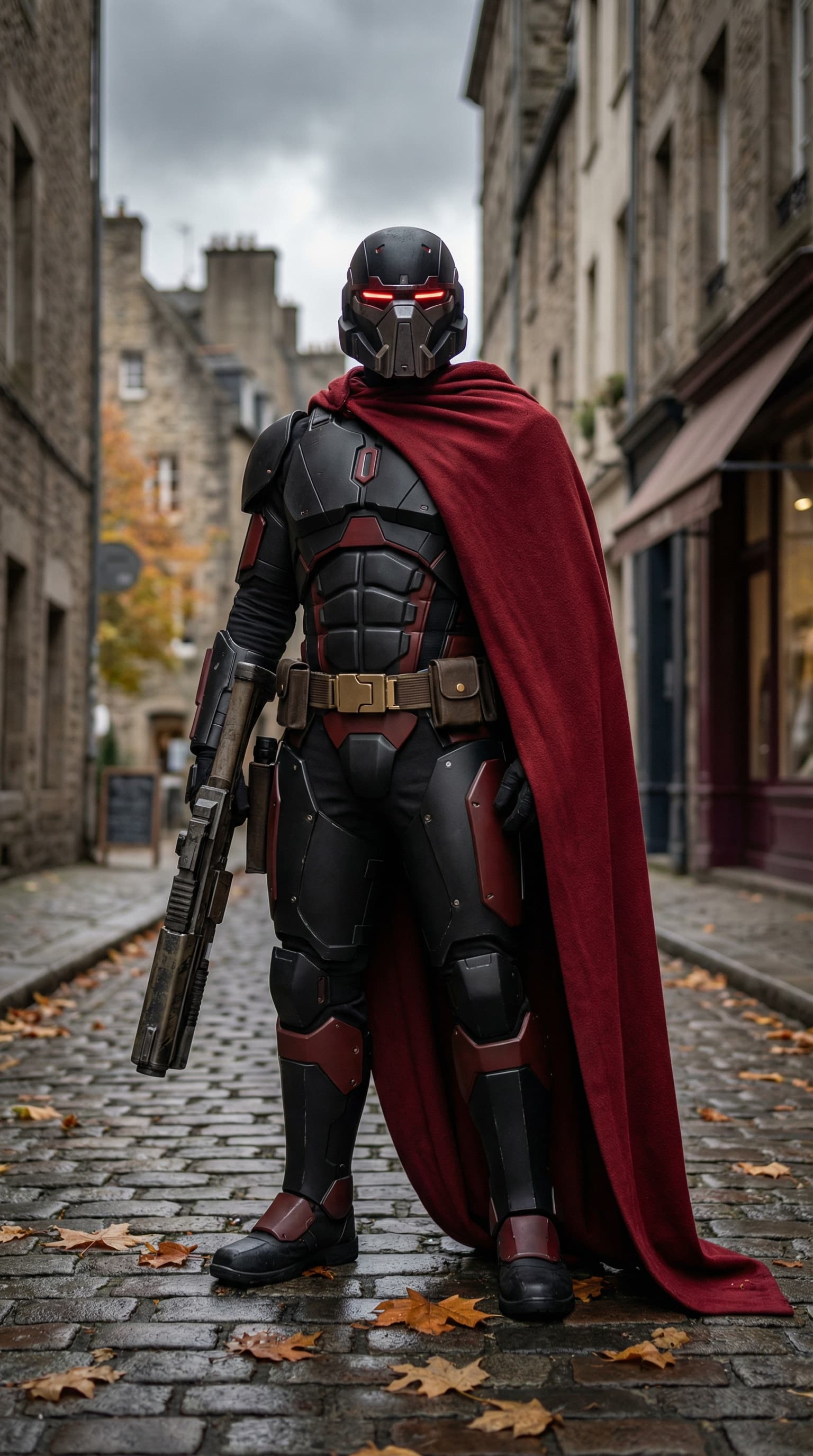 This image depicts a futuristic soldier in full armor and a red cape standing on a cobblestone street. The scene evok...
