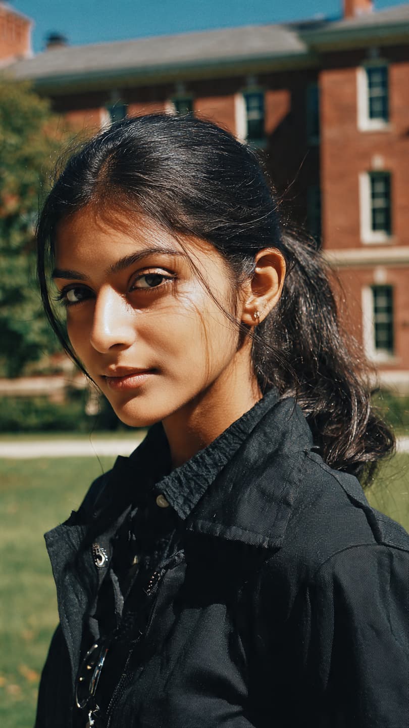 A young Indian woman with dark hair in an open ponytail and a black jacket stand...