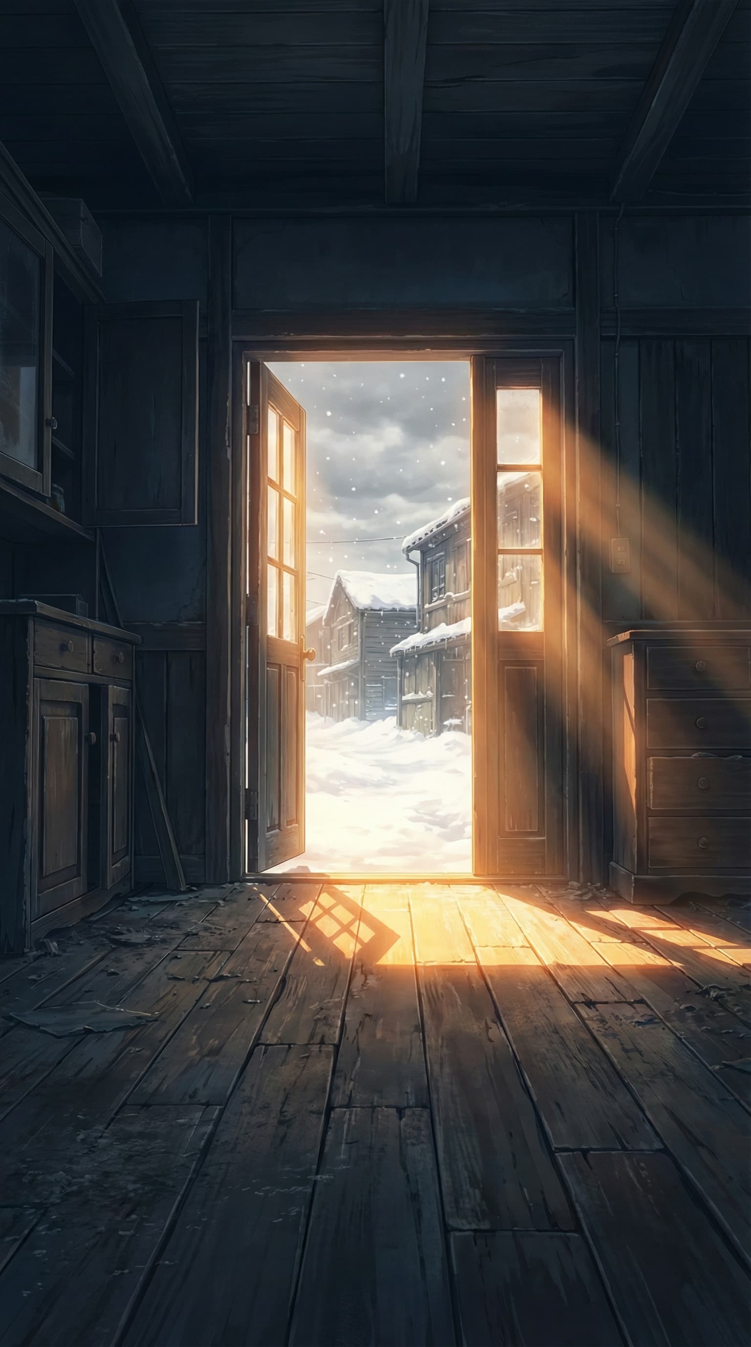 A rustic, dimly lit interior opens onto a snow-covered street bathed in bright sunlight. The warm light spills into t...