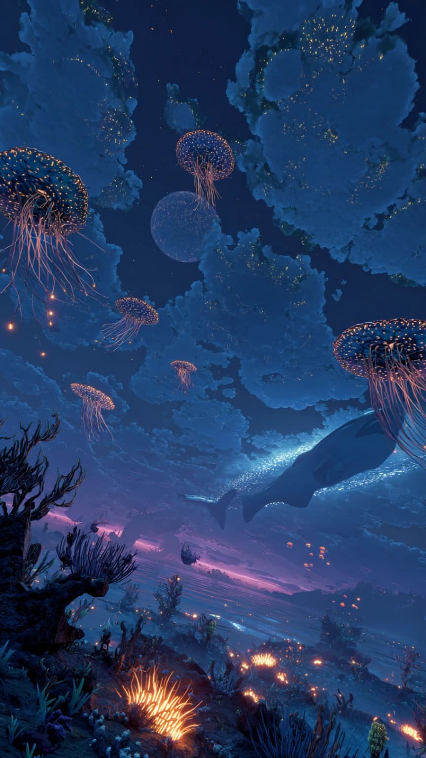A stunning, ultra-wide landscape of the oceanic zone on planet Thalassia Prime, ...